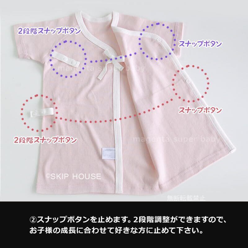 【お着替え簡単な前開きタイプ】お着替えやおむつ替えが楽ちんな前開きタイプです。ワンタッチタイプなので、どんな大きさの赤ちゃんでも調整できるのはもちろん、成長に合わせてやさしくサイズの調整ができます。