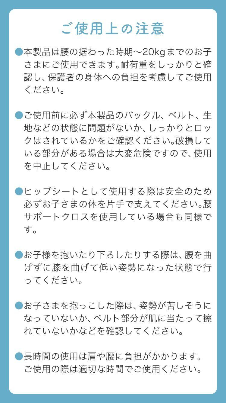 【適応年齢】6ヶ月~5歳頃(※腰が据わったお子様が対象)【耐荷重】20kg【製品サイズ】本体:縦16.5cm×横34.5cm 肩パッド:縦8cm×横47cm 腰パッド:縦9cm×横39cm ベルト:全長121cm ※商品によってはサイズに多少の誤差がある場合がございます。※製品仕様やパッケージは改良のため予告なく変更される場合がございます。※入荷時期によりロゴの位置が変更される場合がございます。