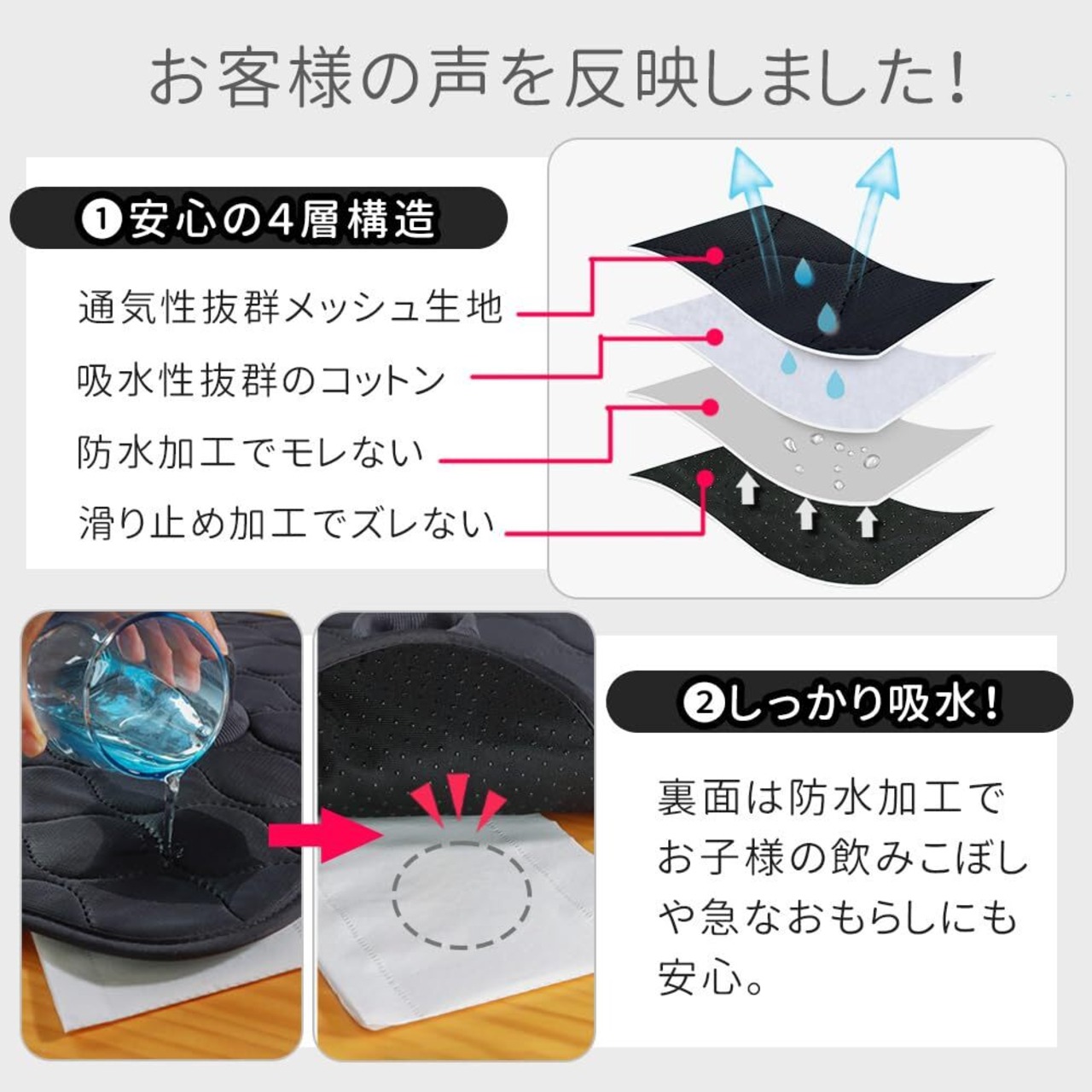 【4層構造】①通気性抜群のメッシュ生地 ②吸水性のあるやわらかコットン ③防水加工のポリエステル ④粒状の滑り止め加工 しっかりとした生地で耐久性も抜群。
