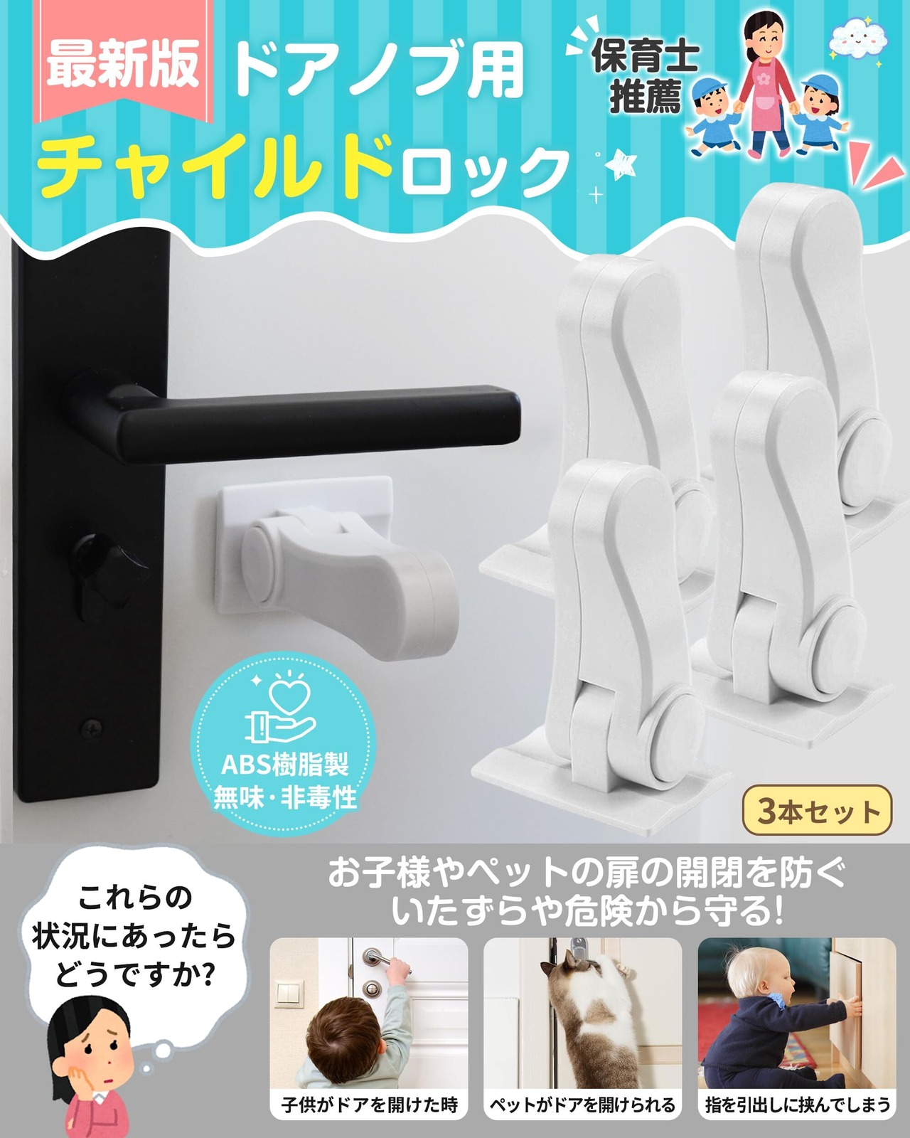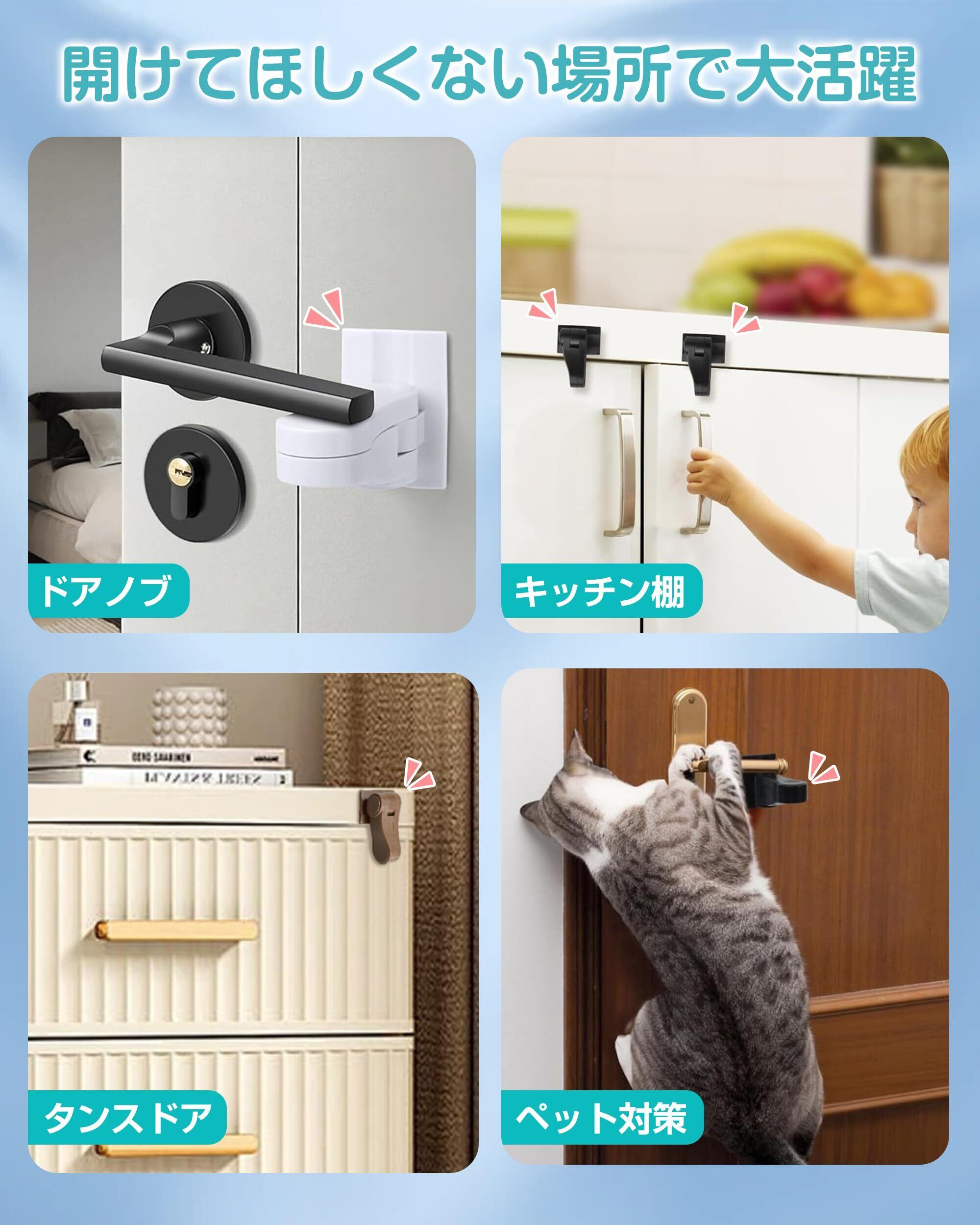【ドアノブ専用チャイルドロック】お子様やペットの扉の開閉を防ぎ、いたずらや予期せぬ危険から守ります。中央のロック部分には内蔵溶接技術を使用しており、非常に強固で耐久性に優れています。180度開閉できるのでドアノブ以外にも設置可能。キッチンや冷蔵庫など開けたら困る場所にも楽々取り付けます。