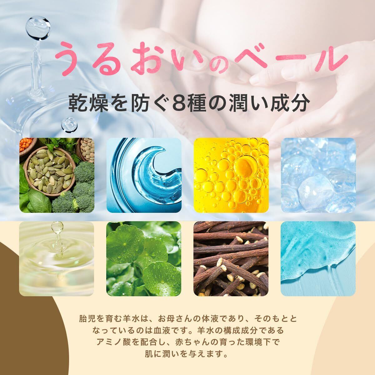 【ママプラセンタ処方】目指したのは「胎脂✕羊水」ママのお腹の中。ママのお腹のなかを参考に8種類の胎脂類似成分やアミノ酸を独自配合しました。