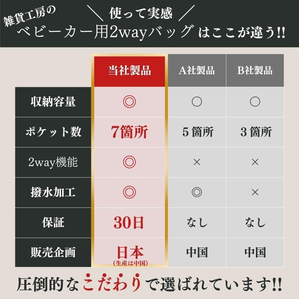 【便利な2wayスタイル】ベビーカーバッグとしてもショルダーバッグとしても使えるので、場所やシーンに合わせて使い分けられます。ベビーカーにはマジックテープ留めで簡単取り付けでき、持ち運び時はショルダーストラップを取り付けて運べます。 【中身が見えて取り出しやすいフルオープン型バッグ】メイン収納スペースは口が広いガバッとしたフルオープン型バッグになります。赤ちゃんやお子さまのお世話セットが全て入って、中身が見えるので、サッと出し入れできます。 【2つのドリンクホルダー+多彩なポケット】保冷保温機能付きのドリンクホルダーに加えて、前面にはサッと取り出せる『ウェットティッシュ用ポケット』、『メッシュポケット』、背面にはチャック付きの『プライバシーポケット』と使い分けて、たくさん収納できます。 【撥水加工】バッグは水をはじく撥水加工を施しております。多少の雨や濡れに強いですが、防水生地・加工ではございませんので、予めご了承下さい。 【日本企業・国内検品】中国国内での生産時と日本国内で二重検品体制を整えております。また、日本人によるアフターフォロー体制も整えております。商品の品質には万全を期しておりますが、万が一商品不具合である場合、交換または返品返金対応を迅速にさせていただきます。