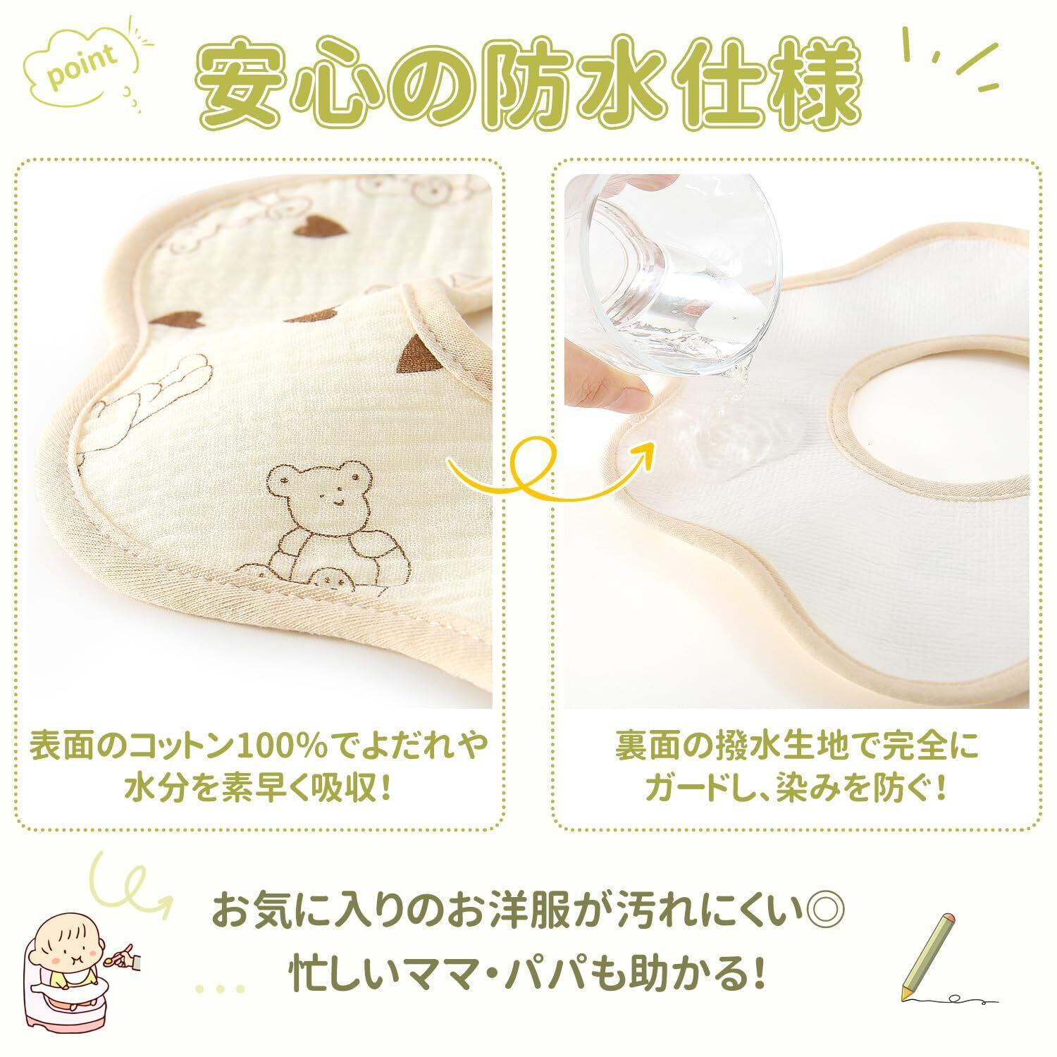 【防水機能の裏地】吸水性に優れた綿素材が、赤ちゃんのよだれを素早く吸収し、発散します。裏面には防水生地を使用しており、水分が衣類に染み込むのを防ぎます。授乳時や離乳食の時間にも、しっかりと防水仕様になっています。