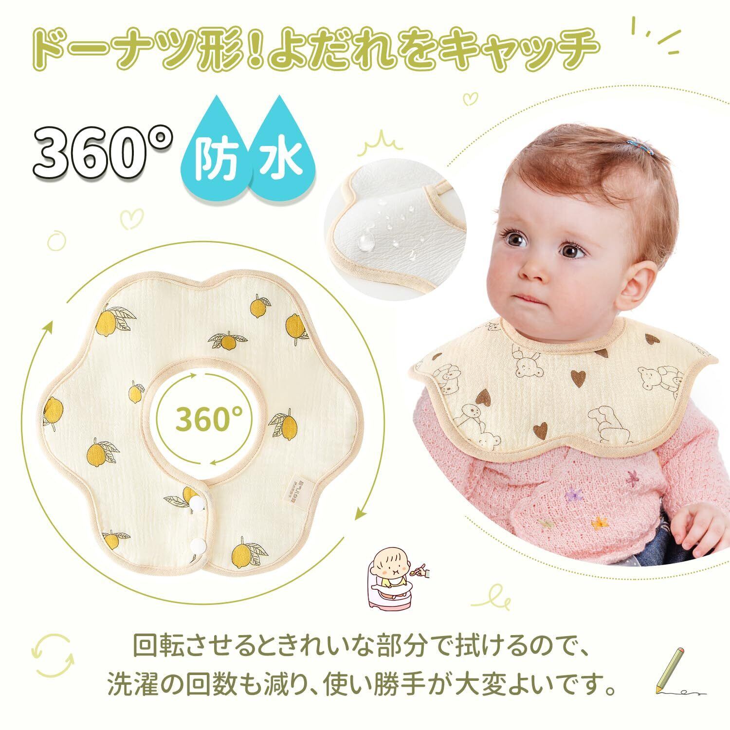 【360°回転デザイン】首回りを360度カバーできる丸型タイプなので、食べこぼしによる汚れ部分を回転させればすぐに清潔面が使えます。首元がぐるりとフィットするため、活発な動きの中でもズレにくい仕様です。