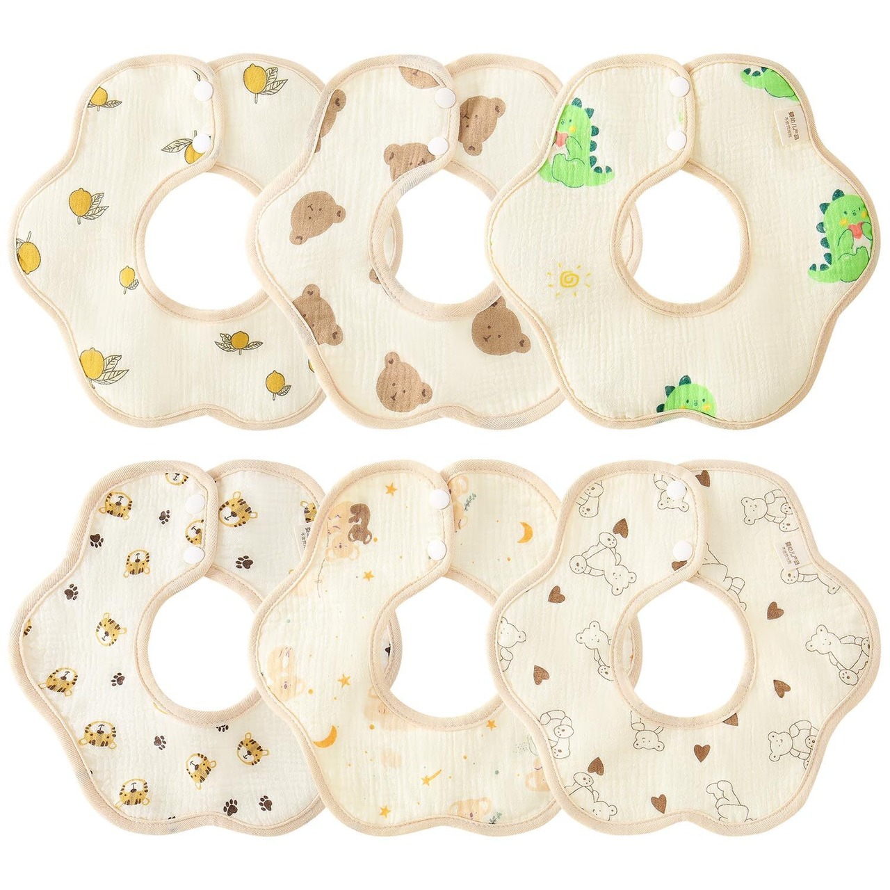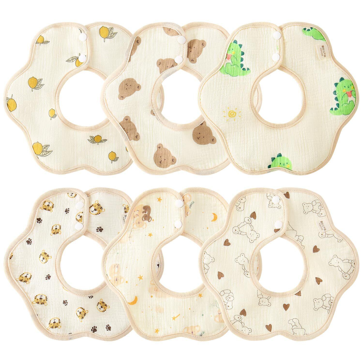 [Comfort U] スタイ ベビー ビブ 6枚セット 男の子 女の子 よだれかけ 花びら型 くるくる 防水性 360度回転 吸水 コットン綿 赤ちゃん エプロン お食事スタイ 動物柄 ベア柄 おでかけ 出産準備 出産祝い ギフト 保育園 入学準備