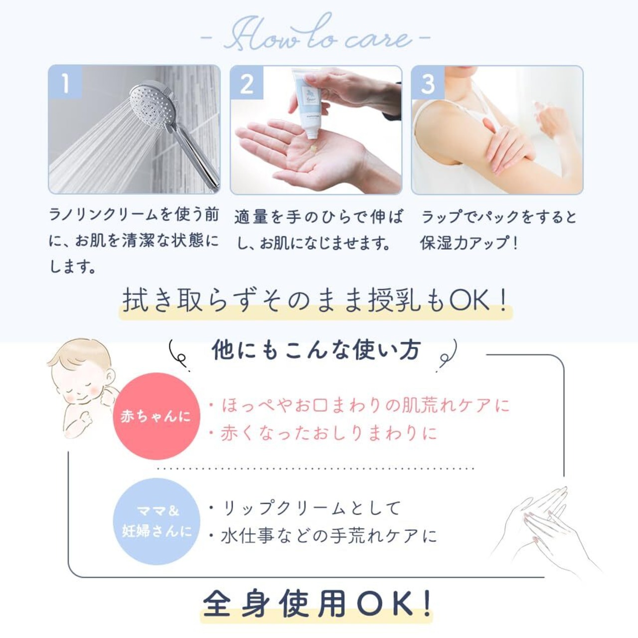 【子供から大人まで使える】ラノリンクリームは自然由来の成分配合なので人の肌になじみやすくお子様が口に入れても大丈夫。全身に使用可能!だからこそ敏感肌や乾燥肌、お子様から大人まで幅広い方にご使用いただいております。