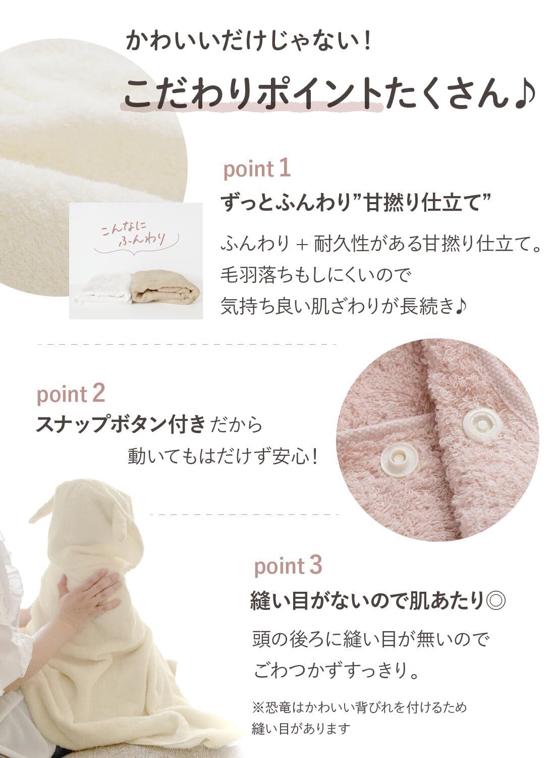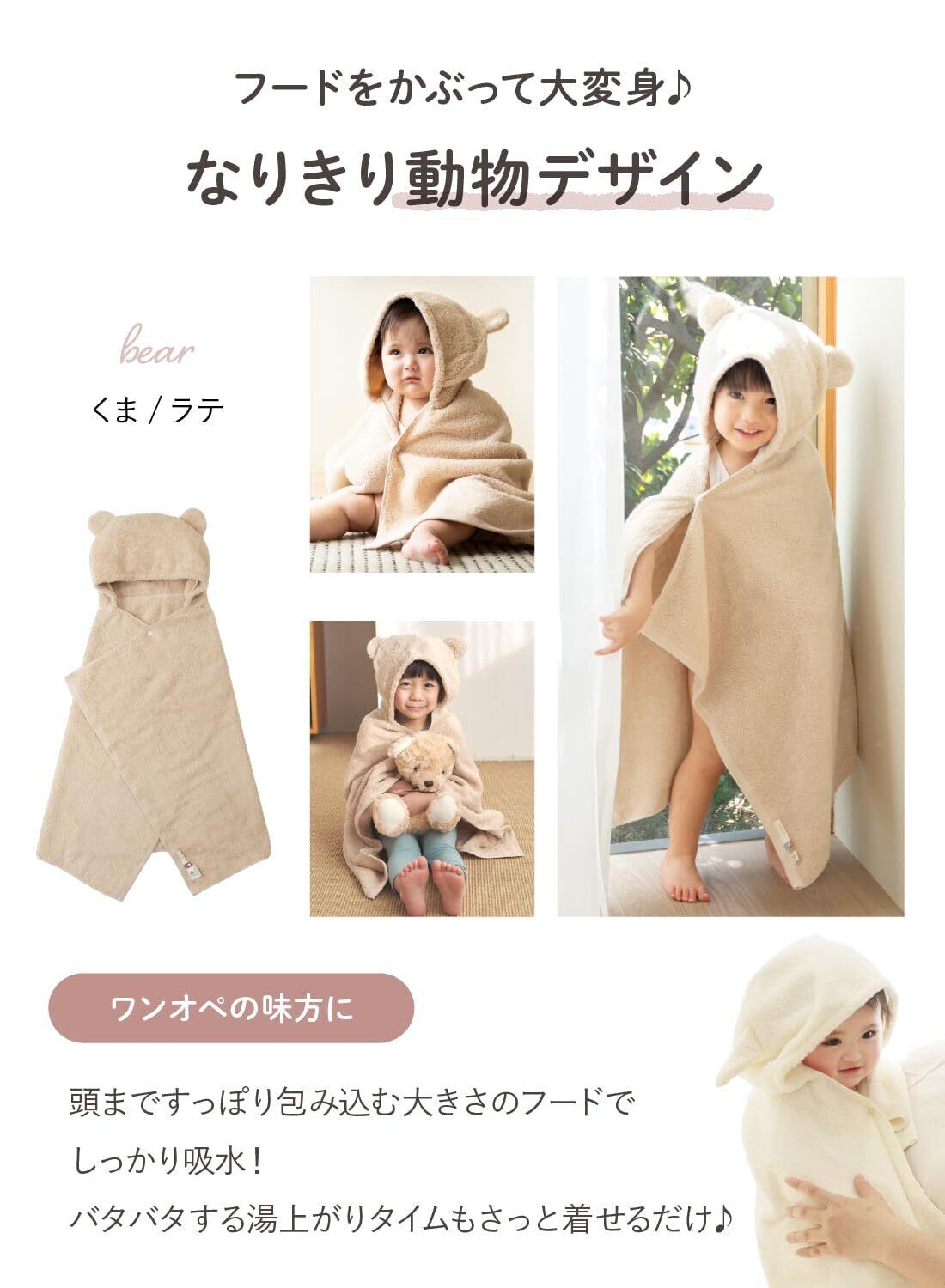 【キュートななりきりデザイン】フードをかぶったらかわいい動物たちに大変身 女の子も男の子も選べる、くま、ひつじ、恐竜の3デザインご用意。人気のくまは男女関係なく使えるベーシックな「ラテ」、キュートな「いちご」の2カラーから選べます。垂れ耳がかわいいひつじはやさしいミルクホワイト、かわいい背びれ付きの恐竜はさわやかなブルーに。毎日のお風呂上りがもっと楽しい時間になりますように。 【大きなフードでしっかり吸水&ワンオペにぴったり】フードは頭をしっかり包み込むサイズなので、お風呂上りにささっと被せるだけでしっかり吸水!バタバタとせわしないお風呂上がりの時間も被せるだけで湯冷めも防いでくれるので、ワンオペ育児の方にもピッタリです。