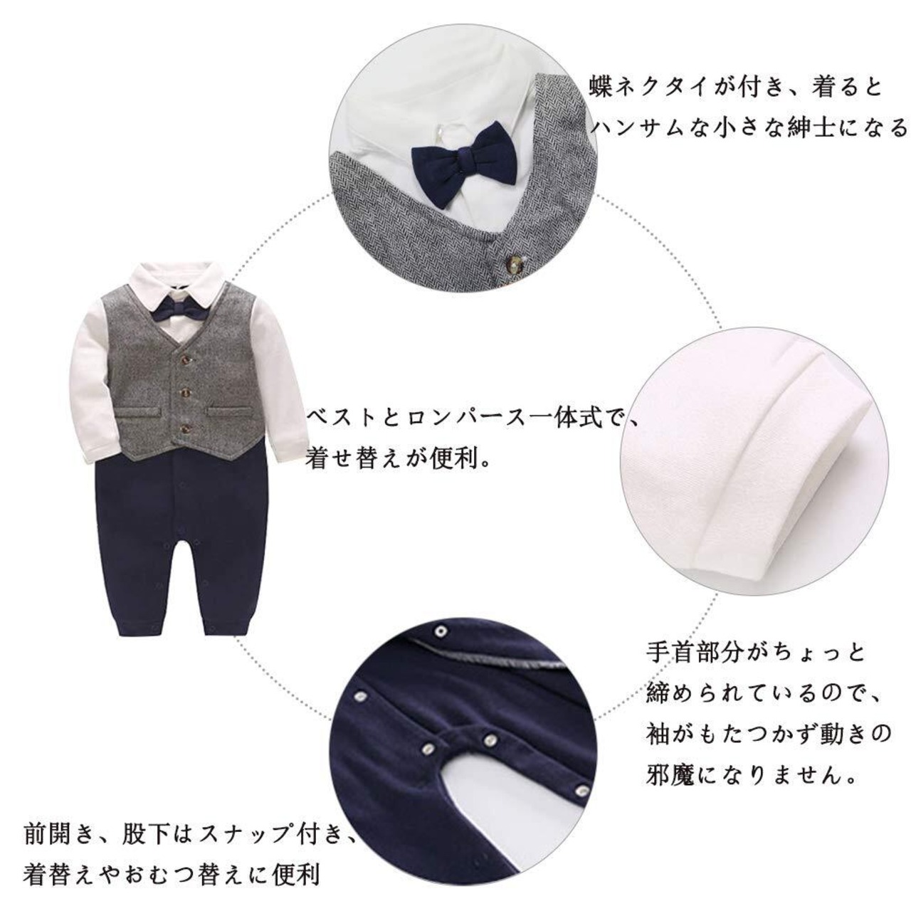 肌触りがとっても気持ちいい綿は、プリントが多様で、着ると紳士になる。かっこいい男の子フォーマルロンパースです。