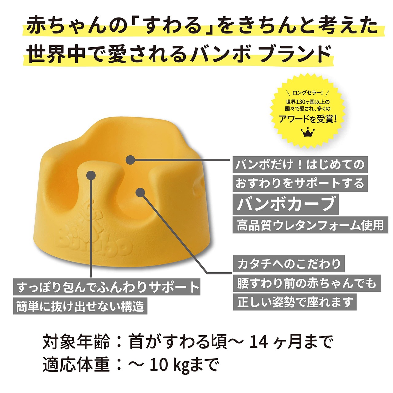 バンボだけ! 一番のこだわり“バンボカーブ" 赤ちゃんが座るとオリジナルのバンボカーブが体に沿って背中やおしりを包み込み、はじめてのおすわりをサポートします。カタチへのこだわり“脚まわり" 腰がすわる前の赤ちゃんでも正しい姿勢で座れるようフィットし、ゆるゆるで不安定にならないよう考えれれたフォルムです。赤ちゃんにやさしい“ふんわりロック" 座った重みでイス全体が赤ちゃんをやさしく包み簡単に抜け出せない構造になっています。ママのことも考えて“お手入れ簡単" 汚し上手で清潔好きな赤ちゃんのため表面加工してあります。さっと拭くだけでキレイになります。お食事やおあそび、屋外でも活躍します。赤ちゃんが使うものだから“やわらか素材" やわらかい上質のポリウレタンフォームを使用。尖ったところや硬い角がありません。転びにくいユニークなカタチ“まんまる底面" ゾウの足のようなどっしり感。安心感と安定感があります。持ち運びもラクラク“軽量" 1.2kgと軽いのでラクラク持ち運び。帰省時や外出先にも気軽に持って出られます。出産祝い、プレゼントにも最適! バンボ ベビーソファは床置き専用です。平らで滑らない床や地面でのみ使用すること。次のような場所では絶対に使用しないこと。台の上や高いところ/テーブルやイスの上/斜面やすべりやすい床面/段差・落差のあるところ/車、自転車など乗り物の中/水上、氷上、浴室やプールなど水辺/ストーブや火気の近く/窓や開口部の近く