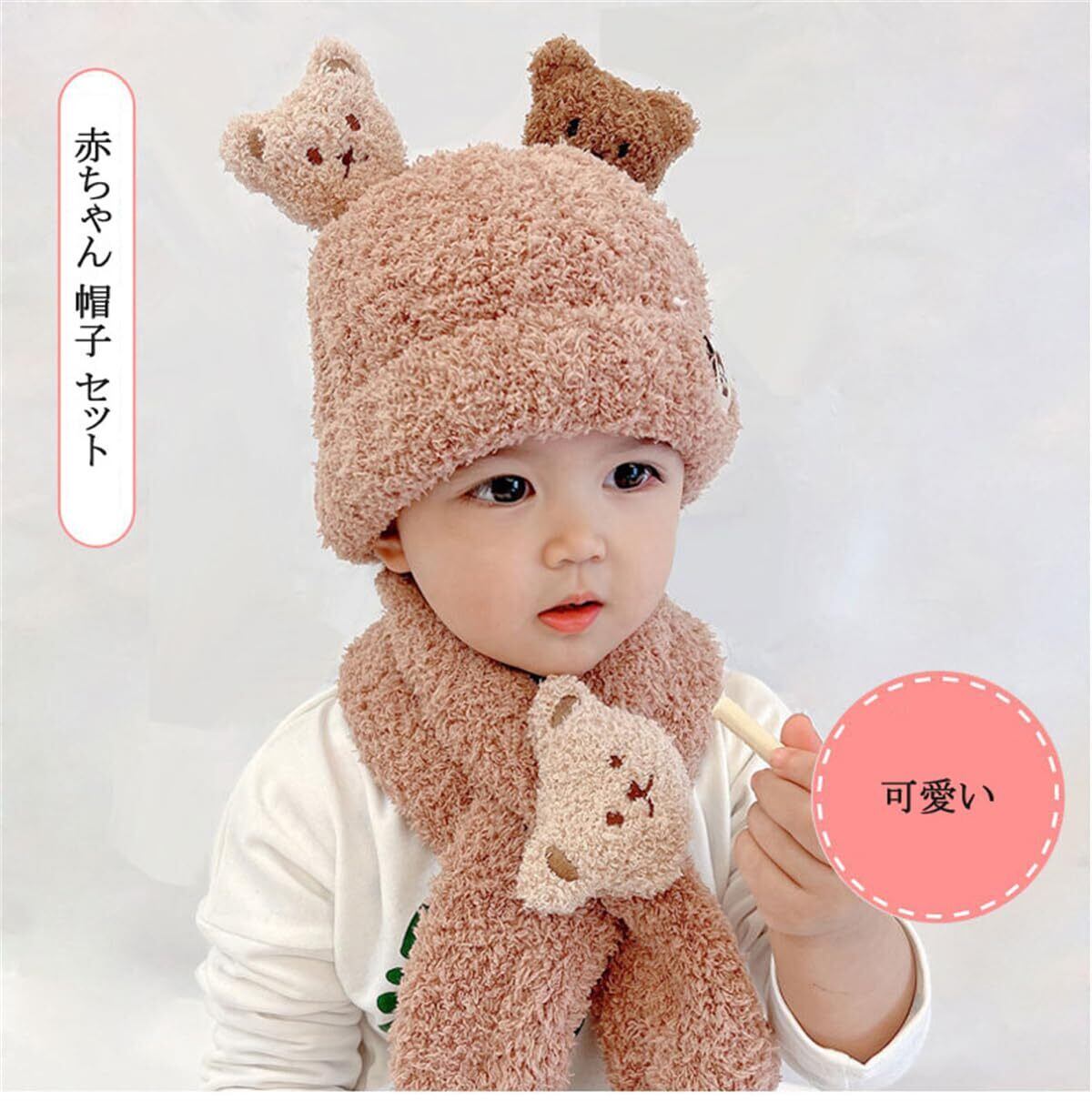 [Lalagen] 赤ちゃん 帽子 冬 ニット帽 赤ちゃん 帽子 マフラー 2点セット ベビー 帽子 マフラー くま耳 子供 帽子 もこもこ 可愛い 暖かい 防寒 誕生日 出産祝い