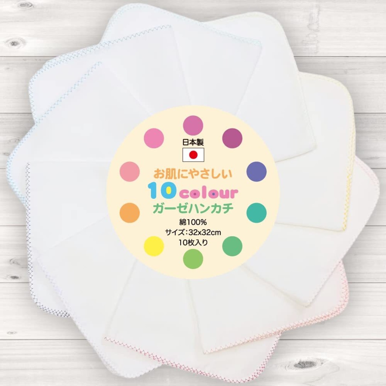 【10colour】ガーゼ ハンカチ 10枚 セット綿100% カラーステッチ 千鳥がけ 千鳥縫い 千鳥縫製 日本製 ホワイト 2層 ガーゼ生地 赤ちゃん ベビー用 出産準備 お口拭き よだれふき 沐浴ガーゼ 無蛍光 無塩素加工 学校用 幼稚園