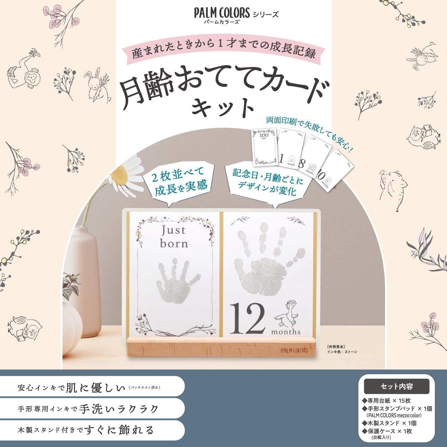 【セット内容】専用台紙15枚(ハガキサイズ148×100mm)、手形スタンプパッド「PALM COLORS mezzo color」1個、木製スタンド1個、保護ケース(台紙入り)1枚