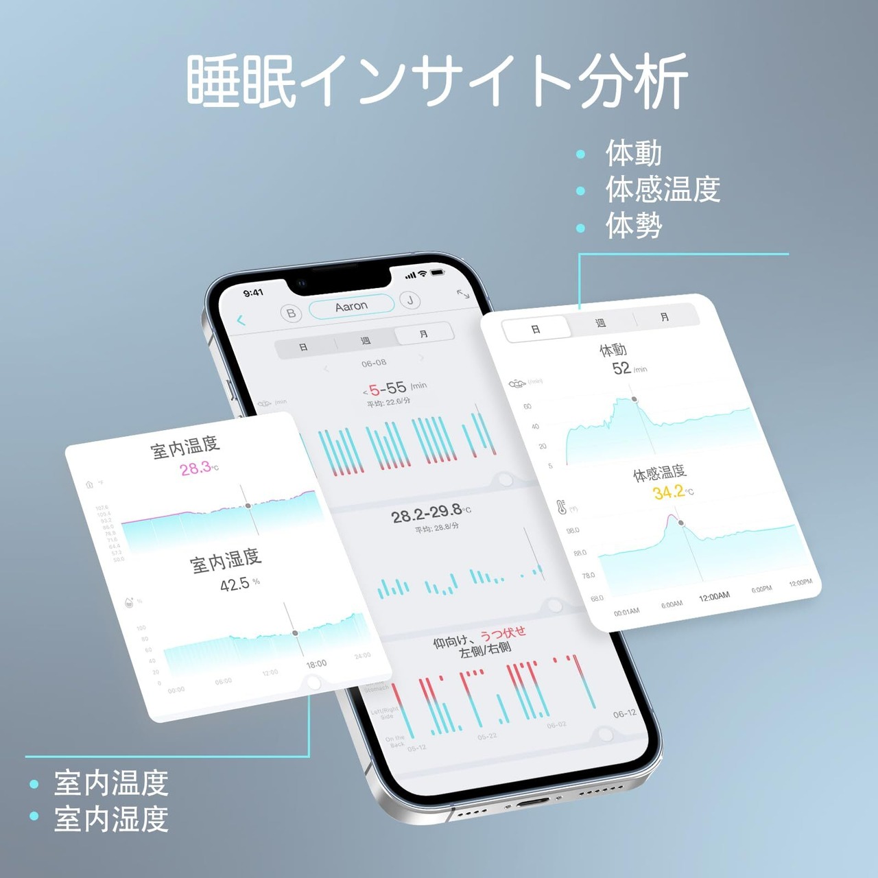赤ちゃんの体動を検知:睡眠中の赤ちゃんの体動を継続的にモニタリングし、赤ちゃんの動きに異変があった場合にはアラーム音でお知らせします。