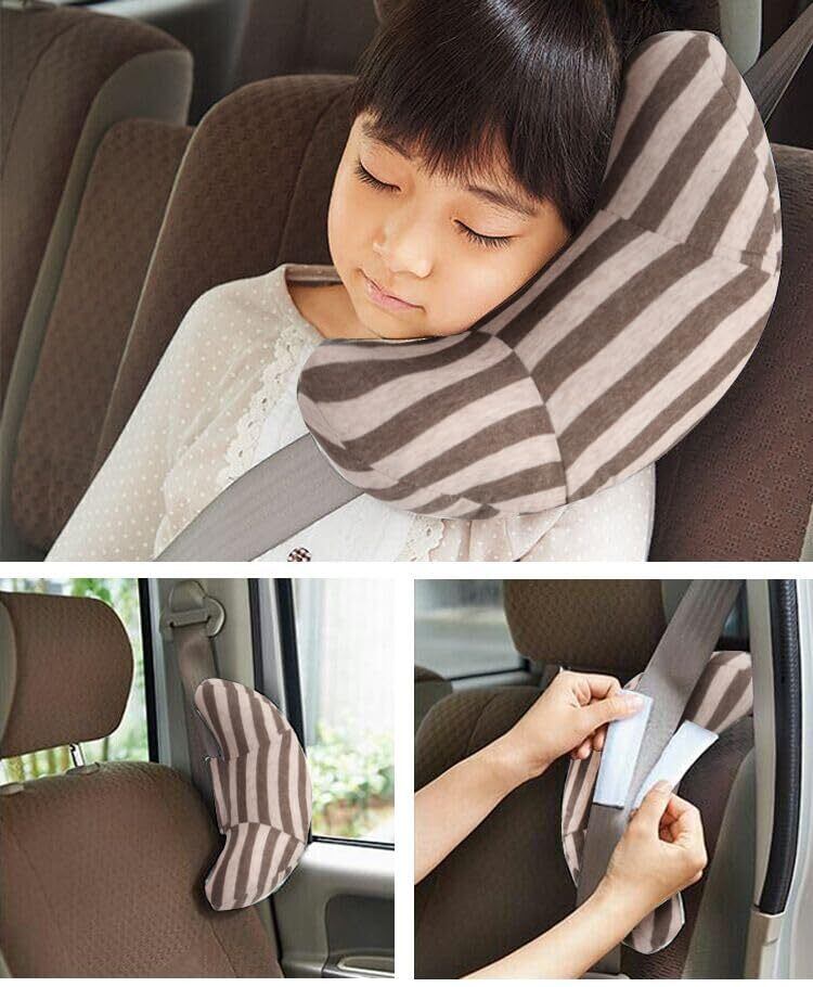 テープで着脱も簡単!シートベルトに固定されており、首の枕が上下に動かないので、より快適に眠れます。運転席やチャイルドシートにも使用されています。