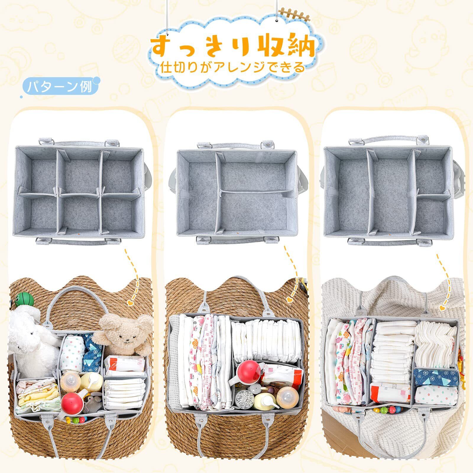 【心込みのデザイン】ポリエステル繊維は汚れに強く、お手入れが簡単!インナーは仕切り板があり、ベビー用品分類し、整理整頓できます。 収納バッグの取っ手は、ベビーベッドや洗面所に簡単にぶら下げるための長くしています。使用しないときは、折りたたんでスペースを節約できます。出産祝い、出産準備、ママへのプレゼントにおすすめです。
