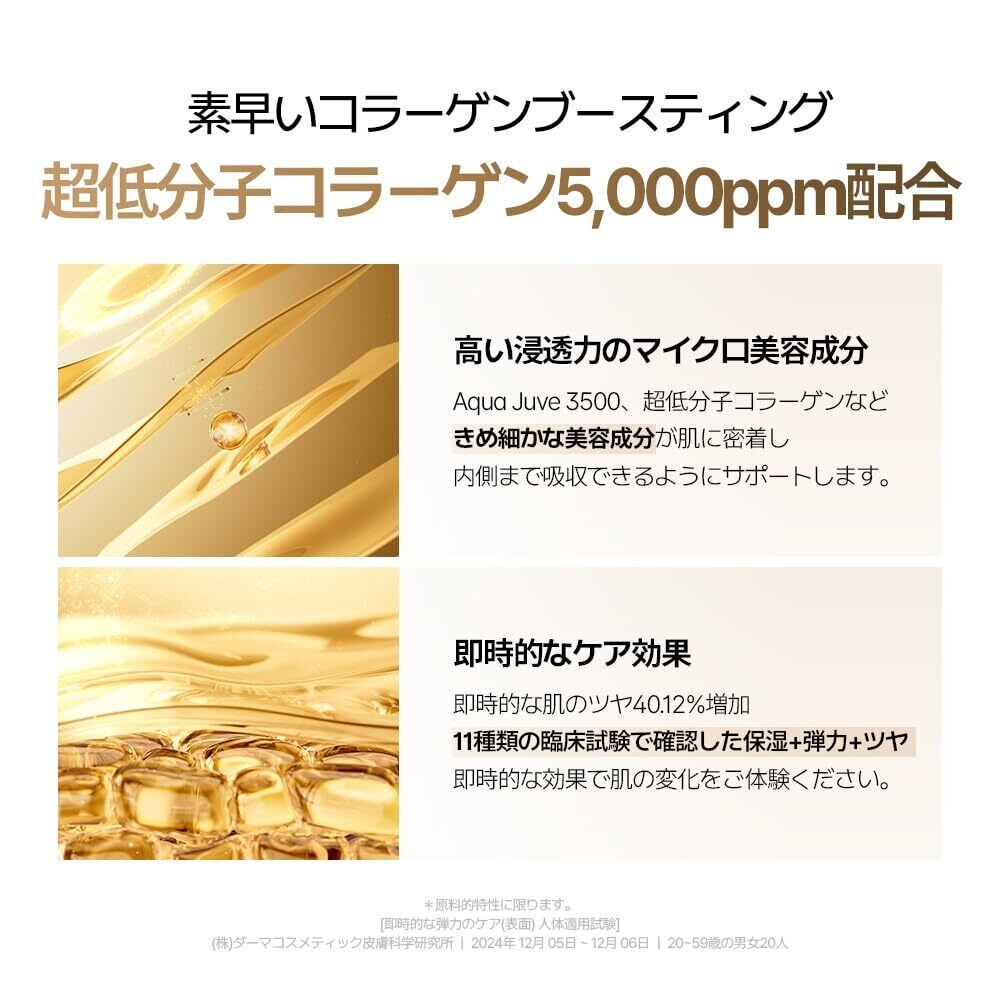 【200Daの超低分子コラーゲン5,000ppm配合】 コラーゲン水, コラーゲンエキスではないコラーゲンそのものが5,000ppm配合され, 200Daのきめ細かいコラーゲン粒子が肌の奥まで浸透し弾力を与えます。コラーゲン配合量をppb基準に換算するとおよそ5,000,000ppbに達する超リアルコラーゲンパックです。