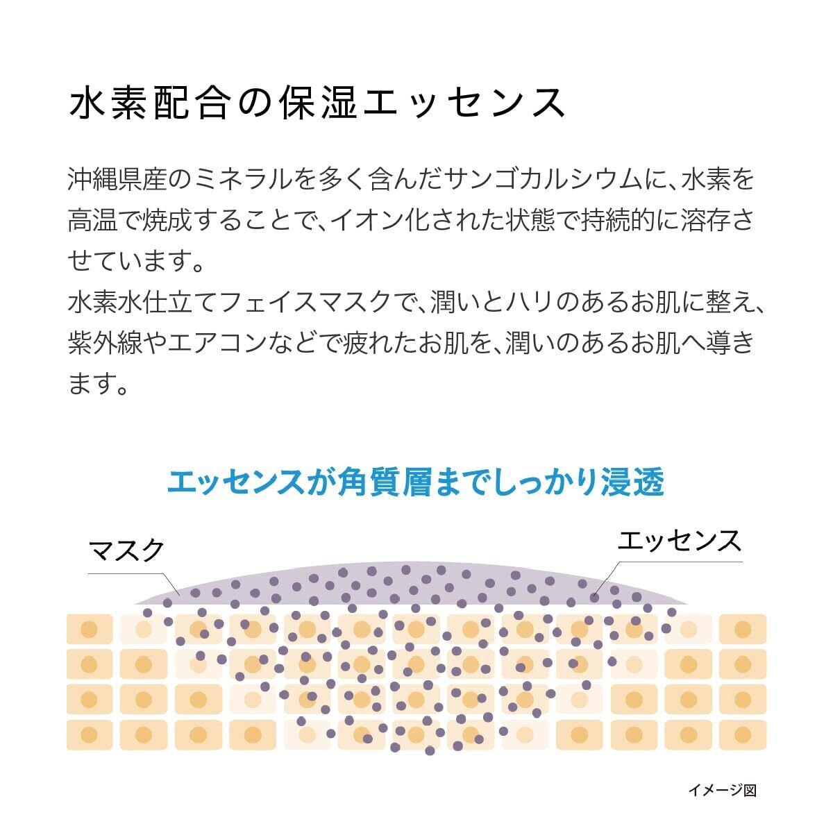 しっとりが続く、水素水仕立ての濃密フェイスマスク。 水素とビタミンC、ビタミンEをベストバランスで配合しました。さらに、弾力の元にコラーゲンやうるおいをサポートするヒアルロン酸、シリカを加えました。 潤いを与え、もっちり肌へ導く美容液マスク。 水素水にナノバブル水をプラスしてより、水分量が増量しました。