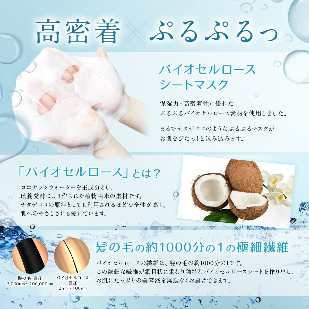 【 高密着・高品質シート素材「バイオセルロース」 】 バイオセルロースとは、ココナッツウォーターを主成分とし、発酵技術を用いて作られる植物由来の新触感シート素材。ナタデココの原料としても利用され、お肌へのやさしさにも優れています。
