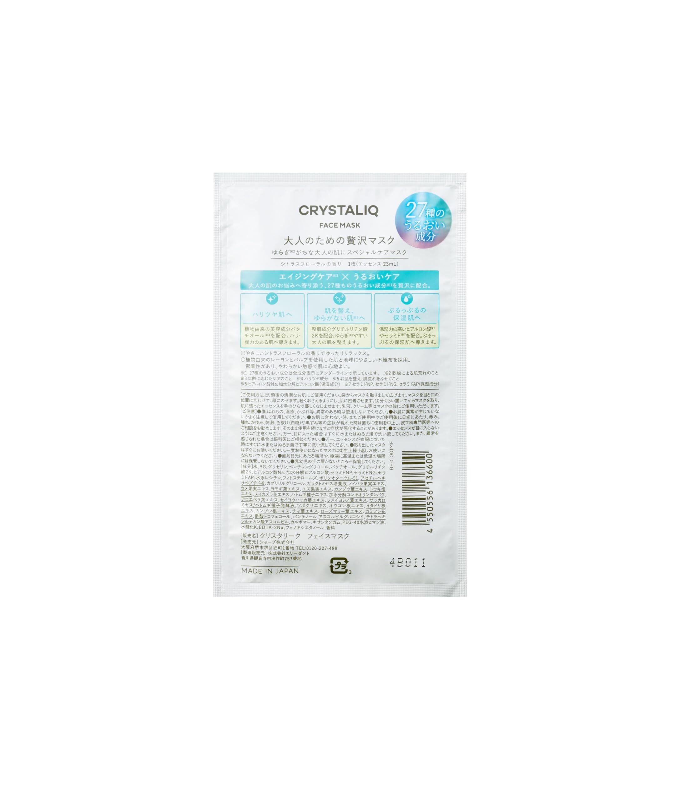 [シャープ公式] フェイスマスク(1箱) 個包装 フェイスパック シート 27種のうるおい成分 日本製 無着色 ハリ/ツヤ 毛穴バクチオール グリチルリチン酸ジカリウム ヒアルロン酸 セラミド メンズ レディース【クリスタリーク】