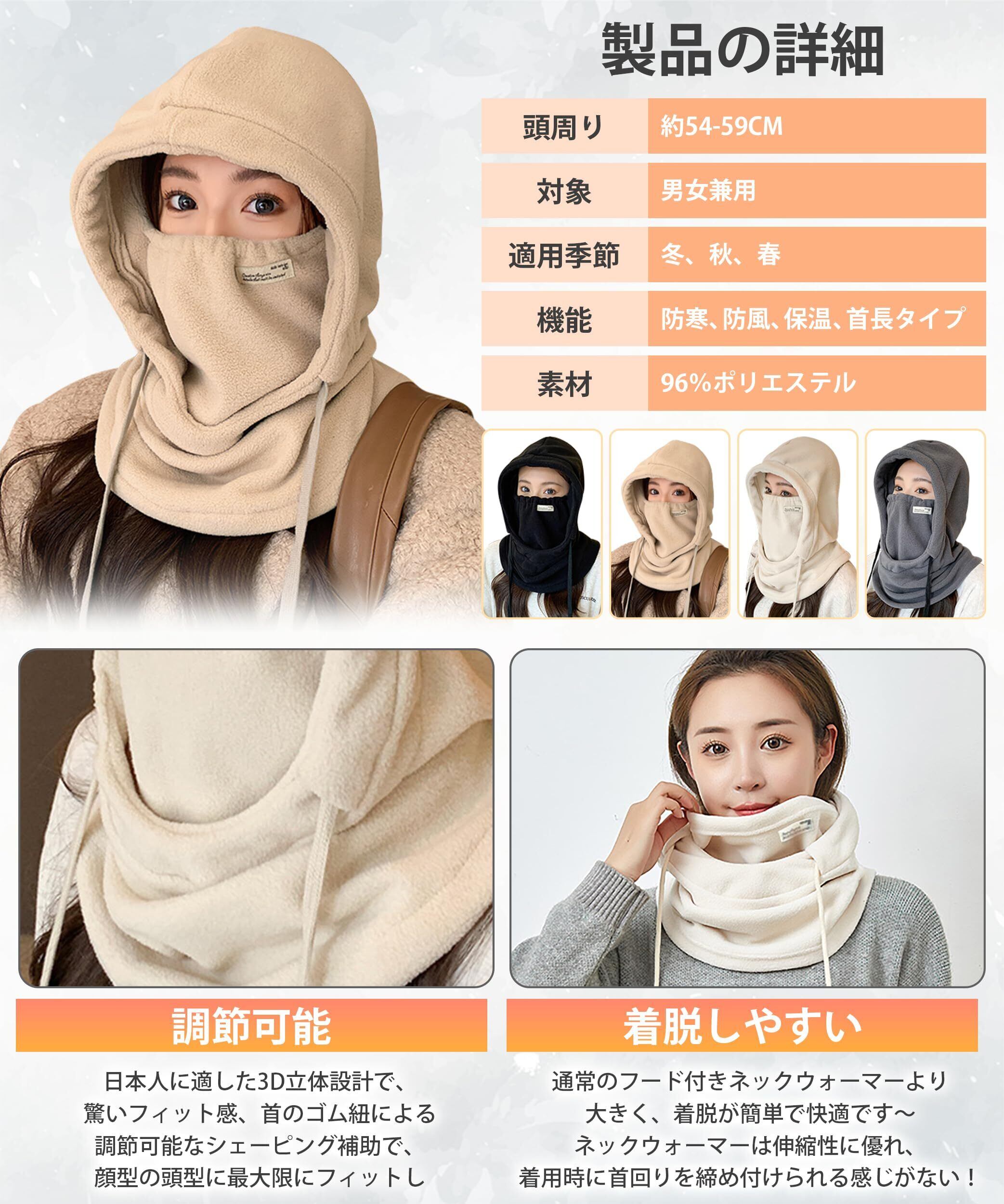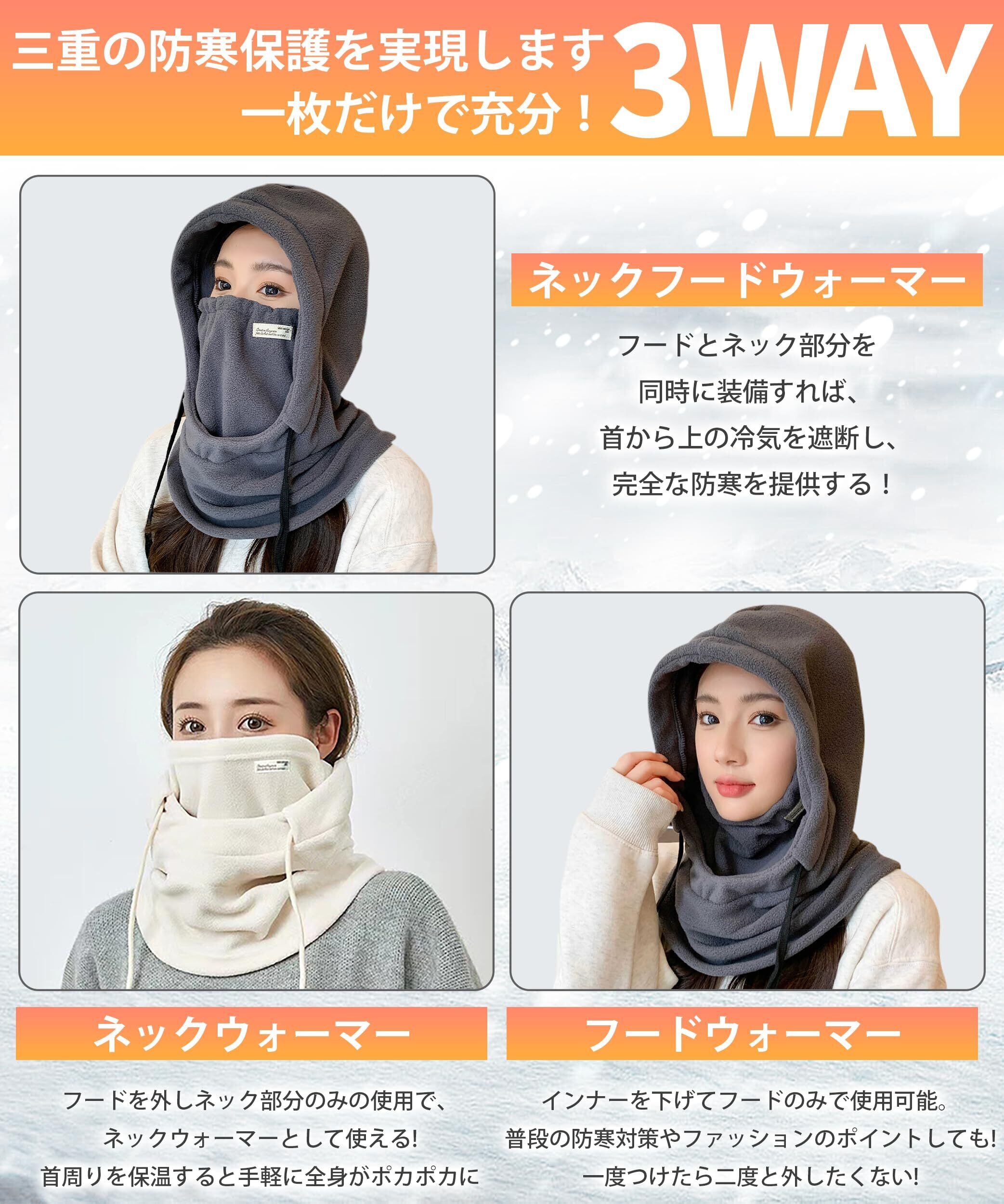 【3Wayスタイル付きのネックウォーマー】 ネックウォーマー1つで3つのニーズに対応します! 帽子(目出し帽)、マスク(フードウォーマー)、マフラー(ネック スカーフ)として使える多機能ネックウォーマーです!三重の防寒保護を実現するフード付きネックウォーマーです。多機能ネックウォーマーは、強風、低温、雨や雪など、複雑天候の変化に優れた適応力を発揮します。帽子やマスク、マフラーとして単体で使用する場合でも、3つを組み合わせて使用する場合でも、ネックウォーマーは簡単に対応できるため、さまざまなシチュエーションで防寒対策を万全にしてくれます。一度つけたら二度と外したくない!