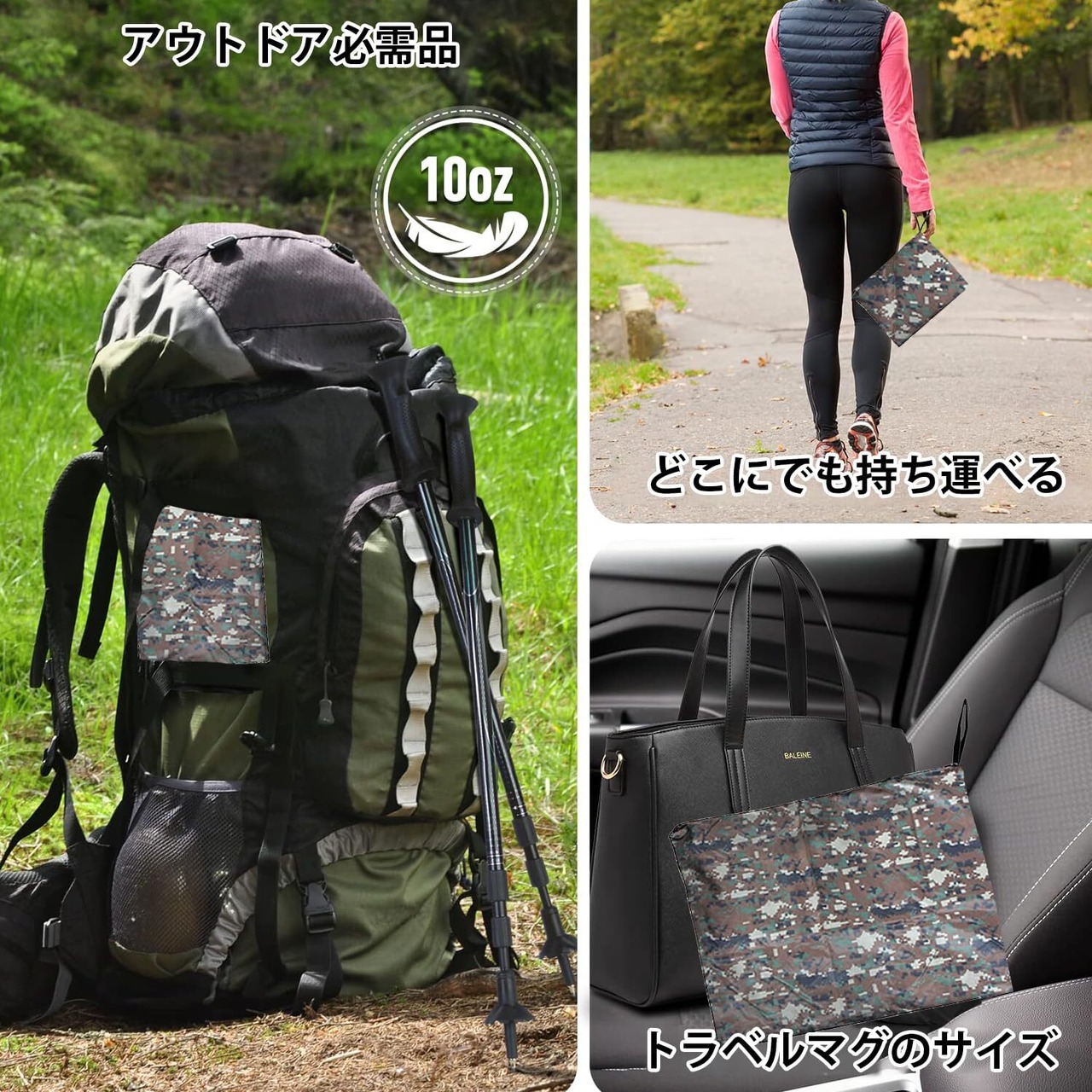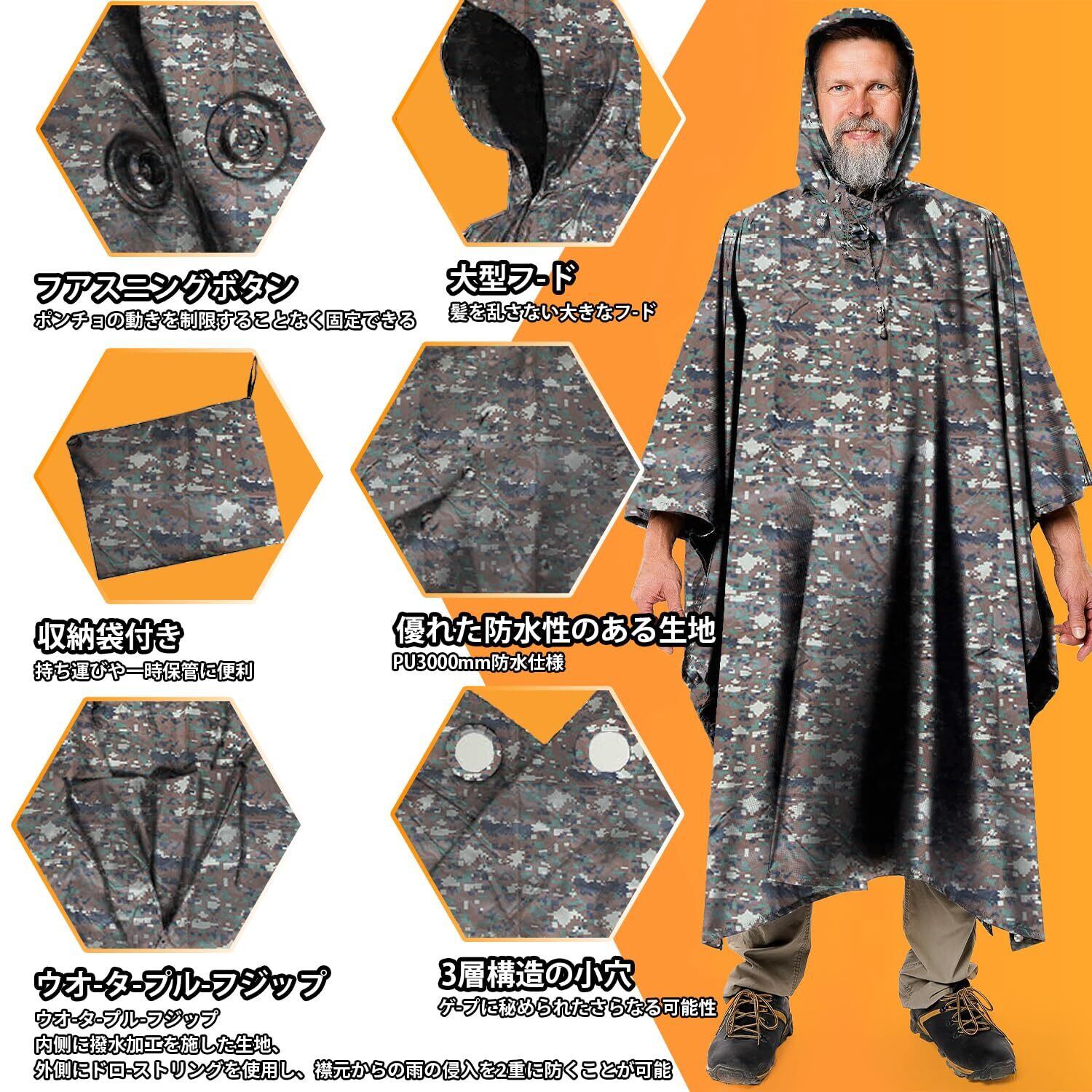 【3-IN-1レインコート】:多用途に使える本ポンチョはアウトドアアクティビティ向けにデザインされています。登山時のレインコートやマット、ハイキングやピクニック、釣り時のサンシェードとして使えます。スナップボタンを外して広げると、レジャーシートとしても使用可能。イスに座っても余裕のある長さ約113cm。リュックを背負っても、すっぽり隠れて濡れないので、雨よけや防寒対策にも最適。