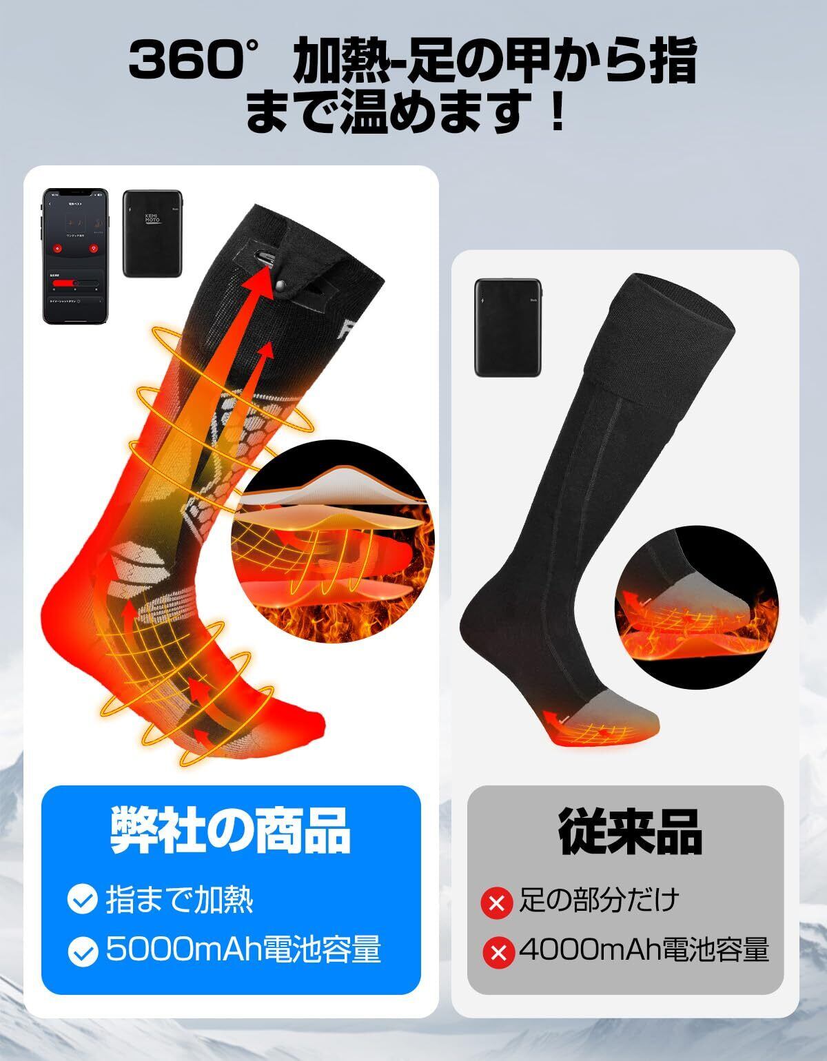 KEMIMOTO 電熱ソックス 暖かい靴下 暖足 ヒーター アップリ操作 45~60℃ 急速加熱 電気靴下 3段階温度調節 水洗い可 防寒対策 冬用 ヒーターソックス 足元 靴下 バイク アウトドア スキー ソックス キャンプ 電気ソックス 暖房 足温める 5V 5000mAh USB充電式 バッテリー2個付き 男女兼用 防寒グッズ ぽかぽか [ブラック] Lサイズ 27.5cm-29.5cm