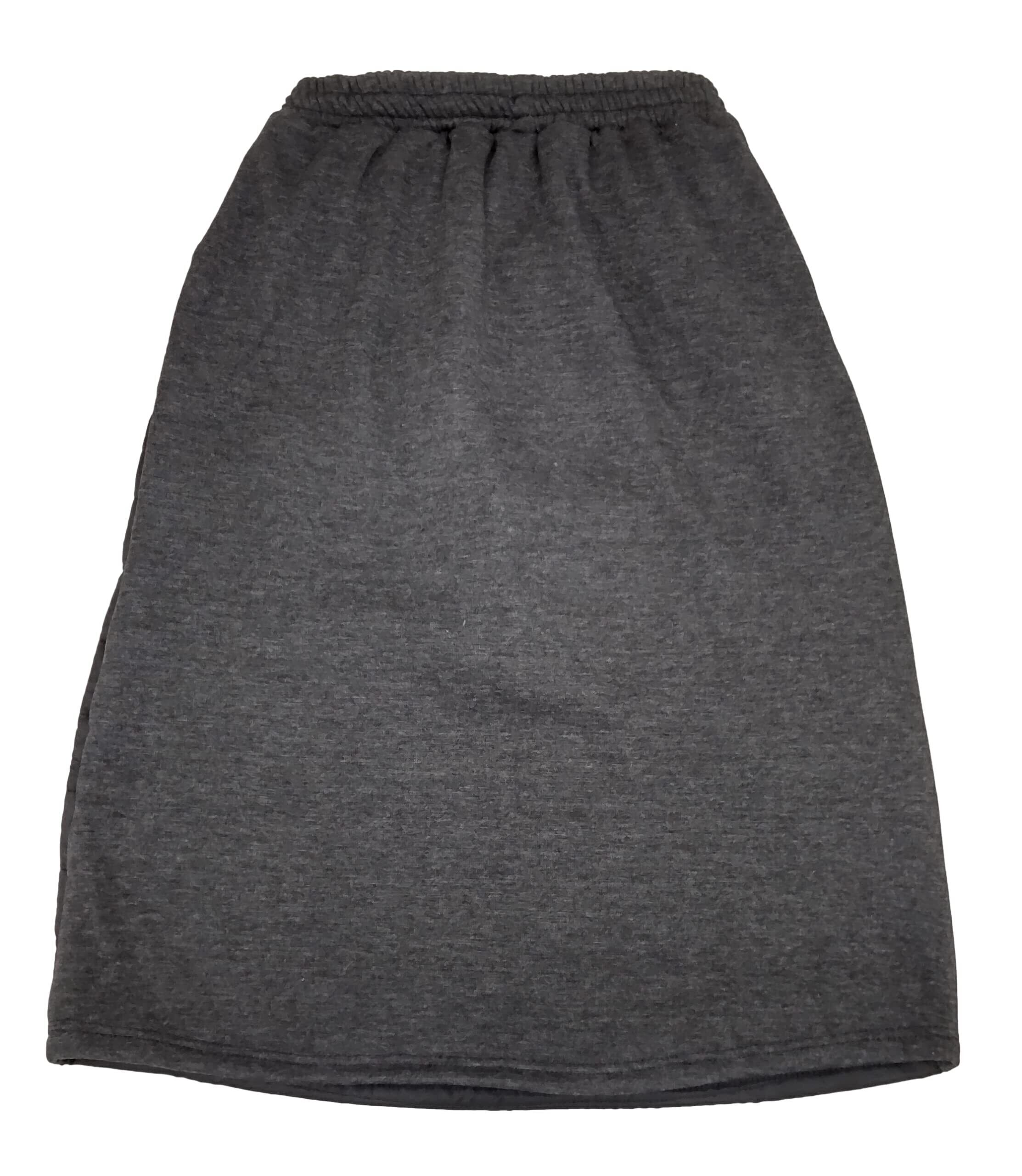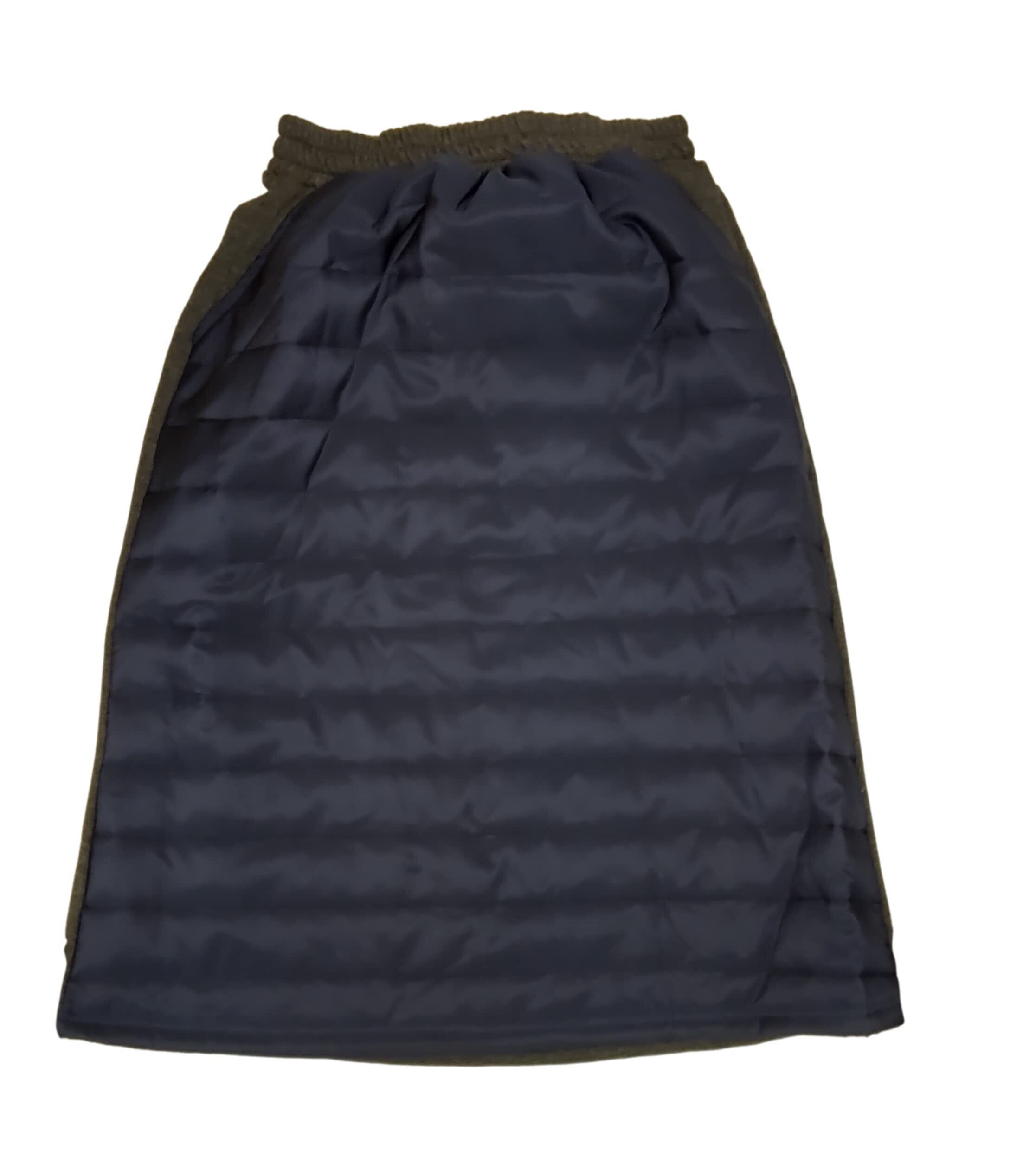 寒い冬にウエストにパンツの上から着用できる前側がキルティングで後側の裏地がシャギーのオーバースカートです。ご家庭の洗濯機で選択可能です。