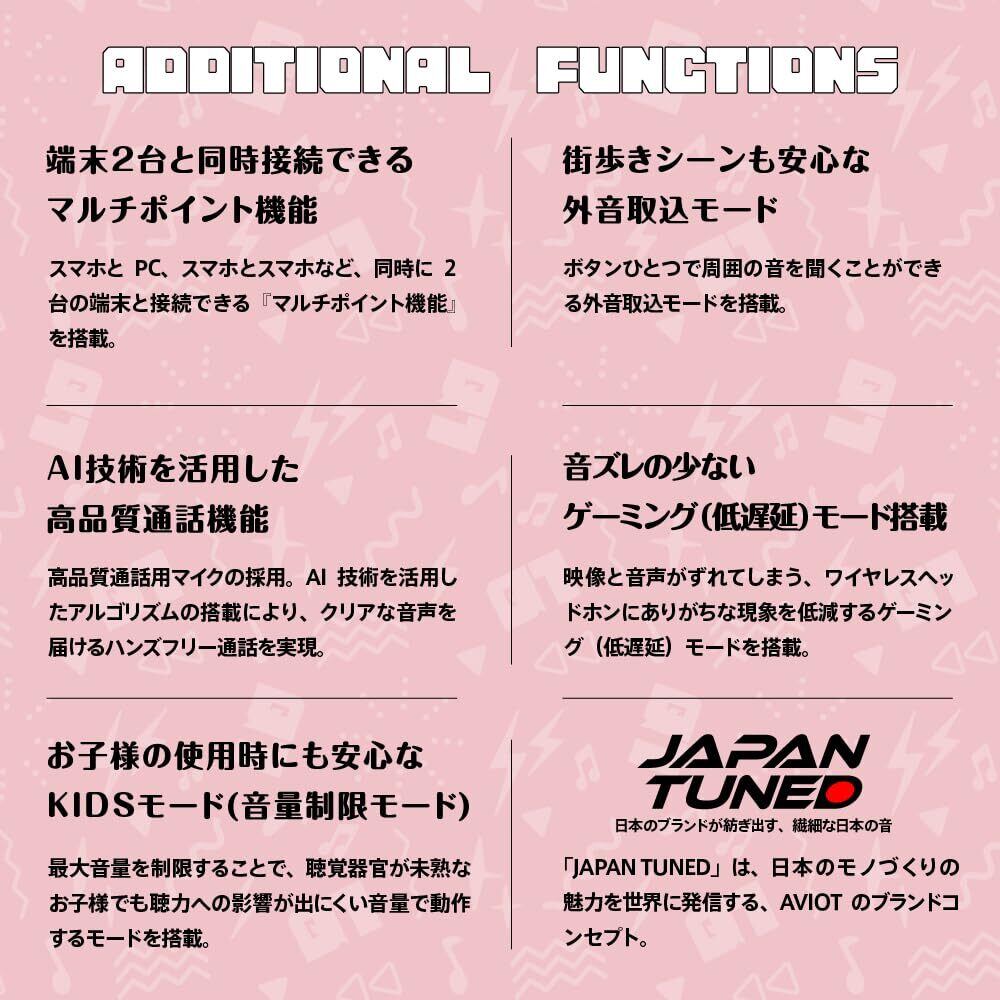豊富な機能でどんなシーンでも使いやすい:2台のデバイスを同時接続可能「マルチポイント機能」・ボタン一つで周囲の音を取り込み「外音取込モード」・「ゲーミングモード(低遅延モード)」・聴覚を守りながら安全に楽しめる「KIDSモード(音量制限モード)」