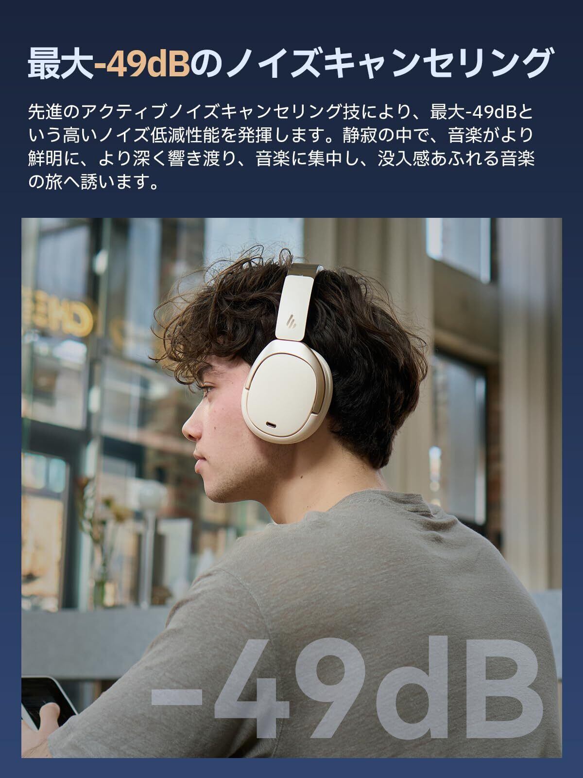 【高音質と快適な使用感を兼ね備えたEdifier W80】Edifier W80は、ハイレゾ音源に対応し、アクティブノイズキャンセリング機能を搭載した、音楽と通話に最適なワイヤレスヘッドホンです。最大-49dBのノイズ低減により、周囲の音を気にせず、音楽や映画に没頭できます。
