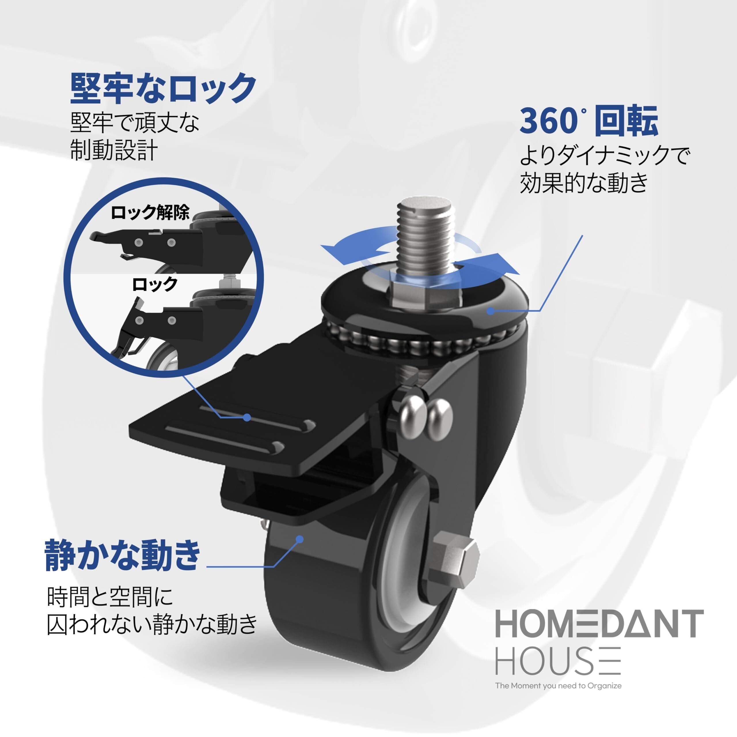 [静かで柔らかい動き] : 静かで転がしやすい棚です。回転キャスターは360度回転するように設計されており、連結された装備を簡単に回すことができます。この機能は、軽い家具やディスプレイアイテムを静かで安全に運ぶのに理想的です。また、各キャスターには安定性のあるロック機能が装備されています。これにより、お好きな時に便利に移動でき、安全な位置を指定することもできますので、安定感と安心感が得られます。