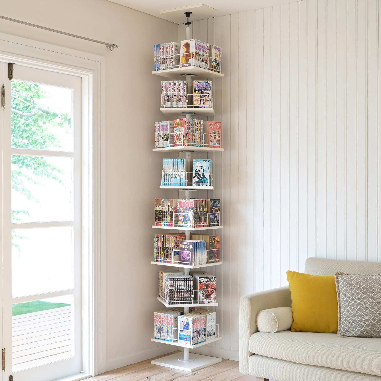 ◆◆ 山善 本棚 ◆突っ張り回転式本棚 ◆大容量 ◆全体耐荷重120kg ◆省スペースラック ◆8段 ◆サイズ:幅34cm×奥行34cm×高さ222-262cm ◆ホワイト/マットホワイト ◆RTKH-3434(WH/MWH)