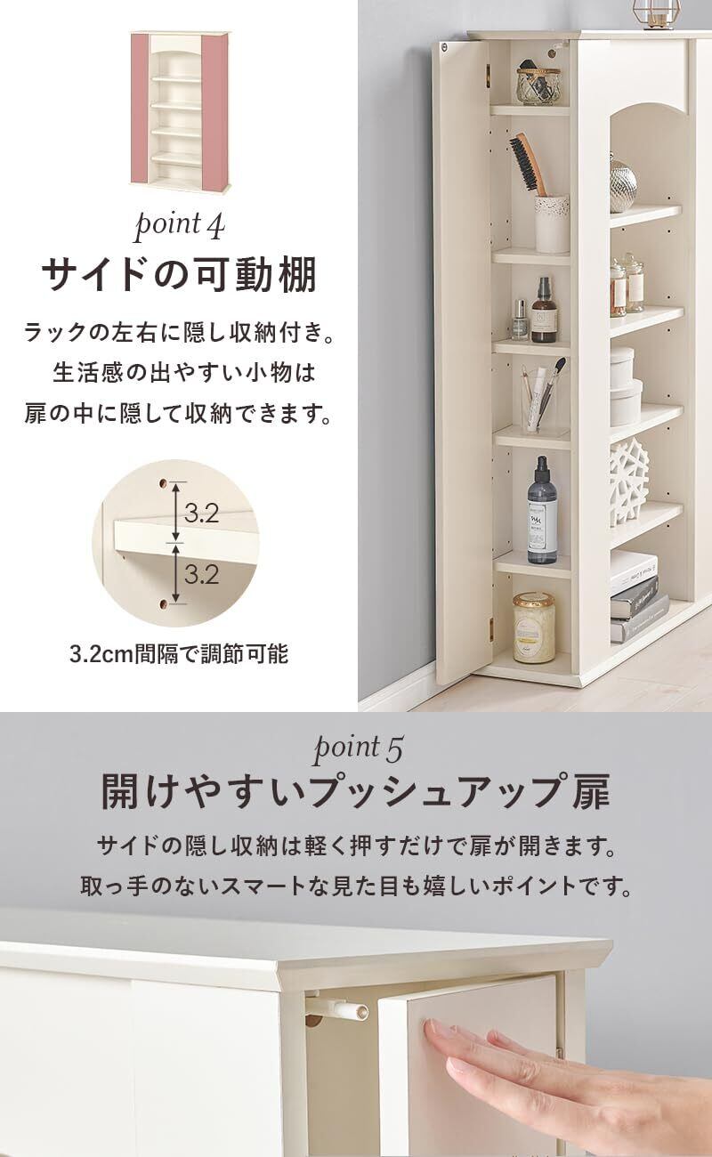 【フロント収納も充実】フロント収納は、置くものに合わせて調整できる為、高さの異なるアイテムも可愛くディスプレイできます。また、棚板は全て取り外しができるので、ディスプレイの幅が一気に広がります。