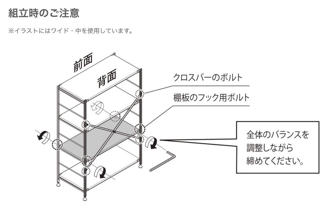 棚板1枚あたりの耐荷重30kgを超えないでください。 棚が適切に床に取り付けられ、安定性のために水平であることを確認してください。