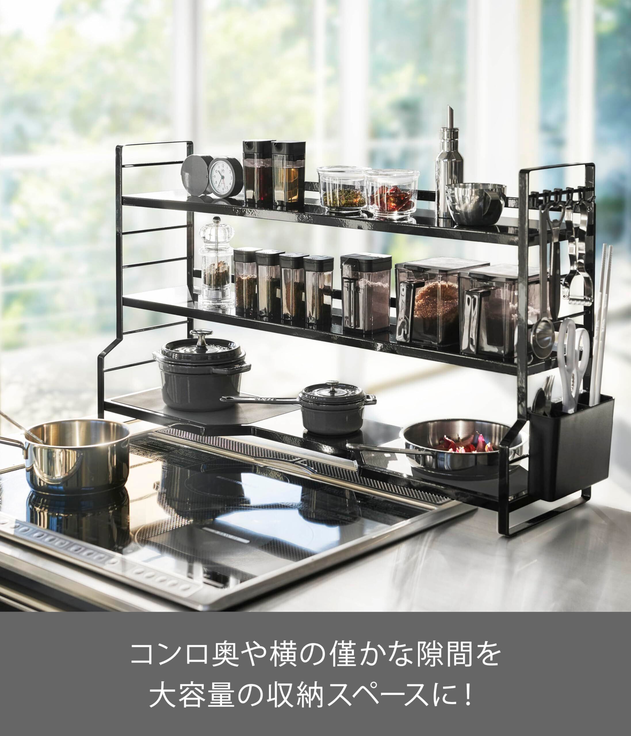 【限られたスペースを最大限に活用するコンロ奥ラック!】山崎実業のコンロ奥ラックは、約W79×D20.5×H46cmのスリム設計で、キッチンのコンロ周りをすっきり整理整頓できます。ブラックのシンプルで洗練されたデザインは、どんなインテリアにもマッチし、スタイリッシュなキッチンづくりをサポートします。