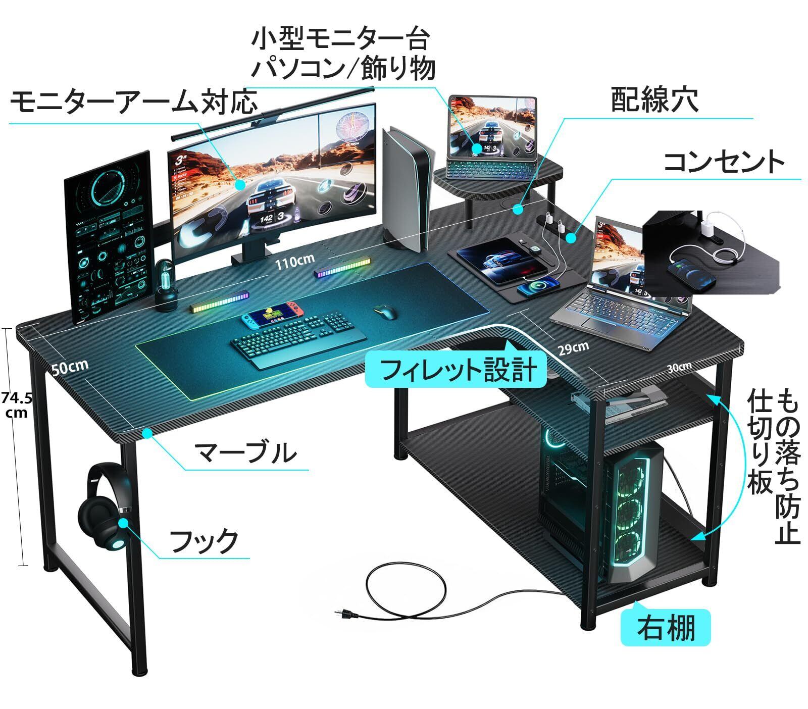 GTRACING ゲーミングデスク パソコン L字 カーボン調 コンセント ラック モニターアーム対応 棚高さ調節可能 小型モニター台 配線穴 右棚 79奥行き*140幅*74.5高さ DL001 Black ジーティーレーシング 机 pcデスク 勉強机 オフィス 書斎 棚付きl字 ゲーム ワーク