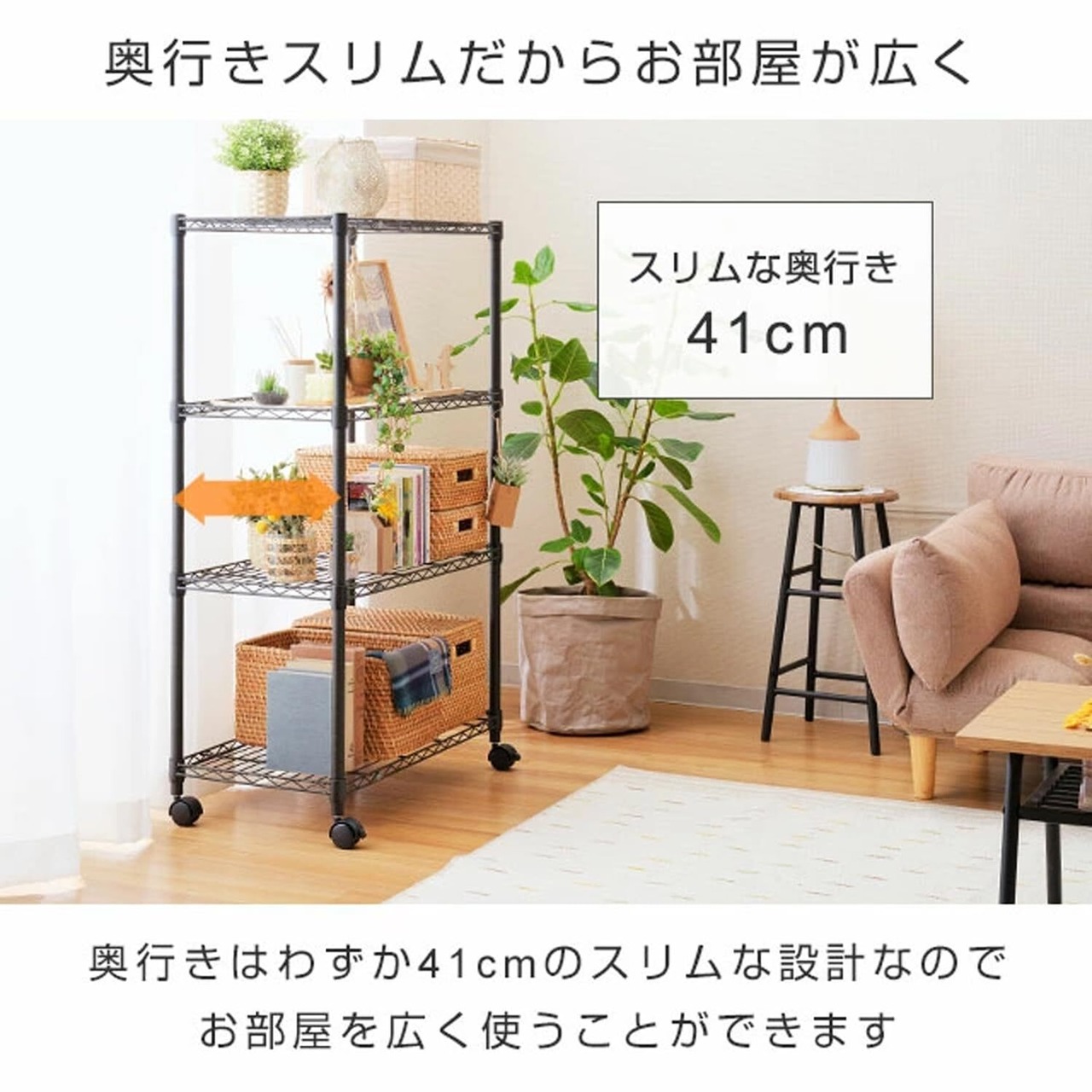 ◆◆ ドウシシャ ルミナス ノワール ラック ◆4段 ◆幅80 ◆奥行40 ◆キャスター付き ◆スチールラック ◆黒 ◆ブラック ◆収納棚 ◆おしゃれ ◆キッチンラック ◆サビに強い ◆組立簡単 ◆幅81×奥行41×高さ125.5cm(キャスター込) ◆ポール径25mm ◆耐荷重80kg ◆NO8012-4
