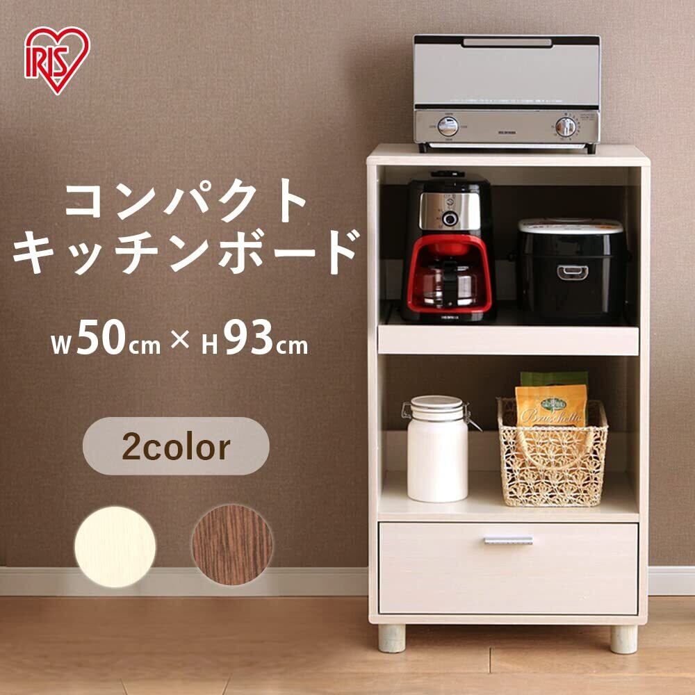 【シンプルで機能的なアイリスオーヤマのキッチンボード!】幅50cm、奥行37cm、高さ93.8cmのコンパクト設計は、限られたスペースでも効率的に使うことができます。オフホワイトの優しい色合いが、キッチンやダイニングを明るく演出します。