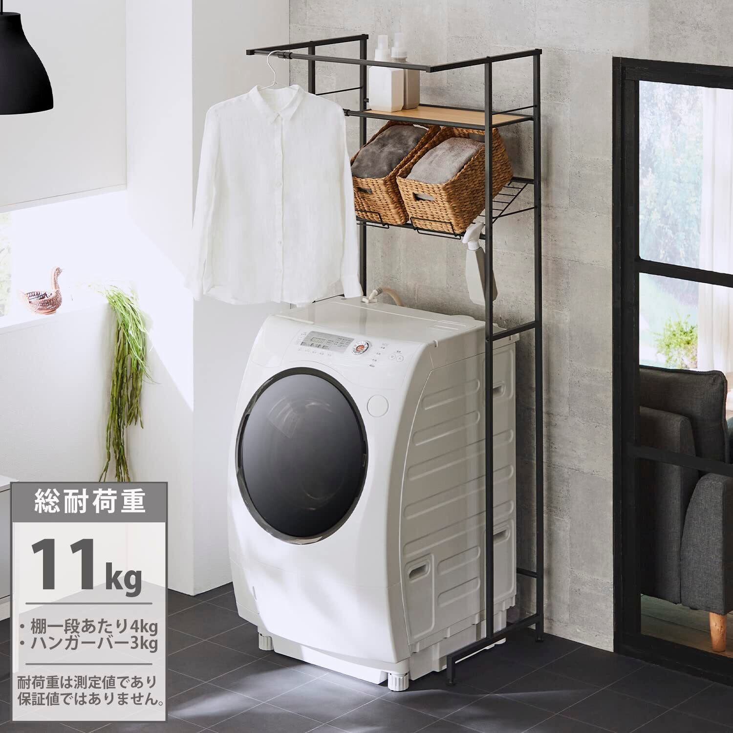 HEIAN SHINDO 壁面収納 バスケット台・ハンガーバー付き 横伸縮 縦型ドラム式両対応 角パイプ 木目マットブラック 幅64~82×奥行53×高182cm HSR-4BK 平安伸銅工業