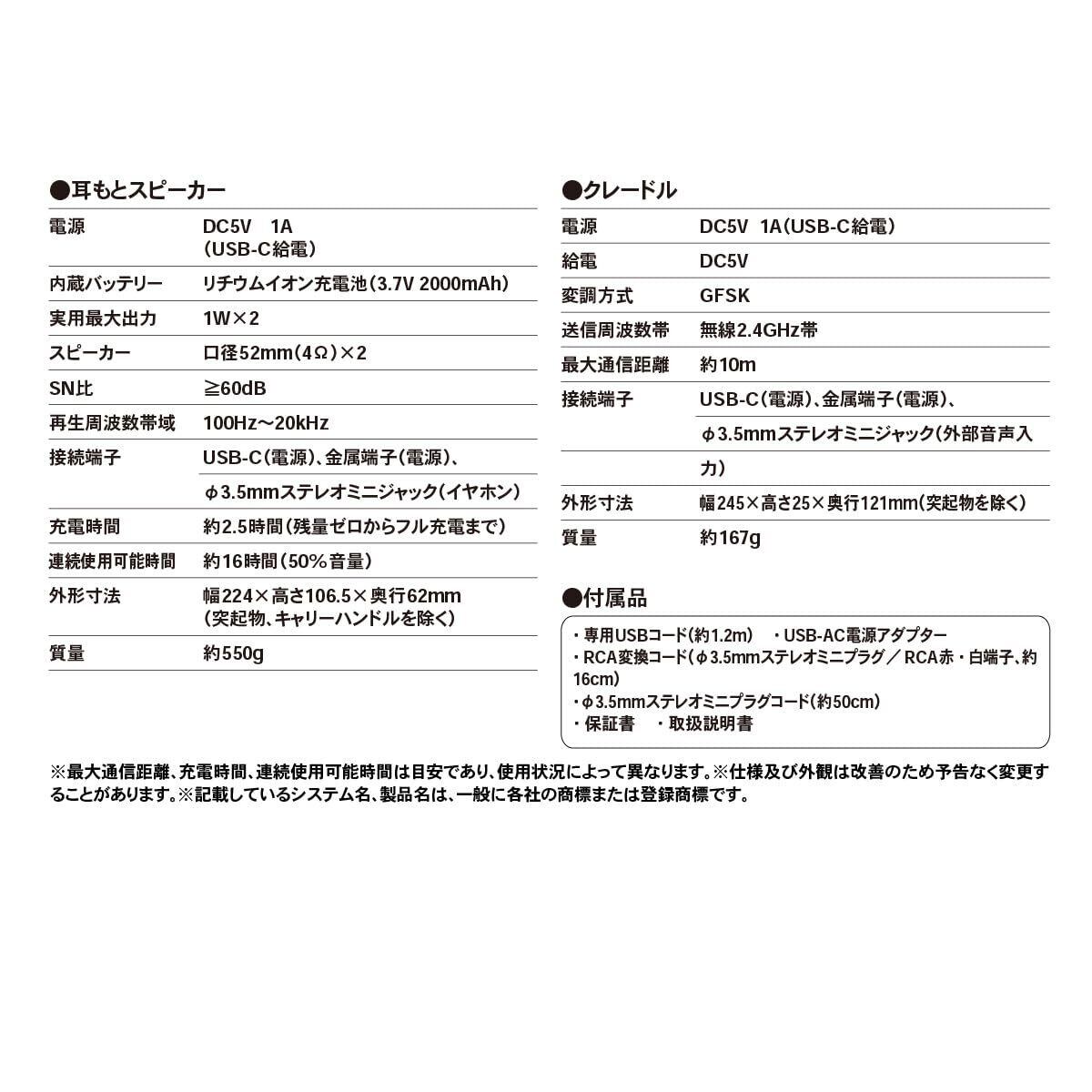 ◆接続端子:USB-C(電源)、金属端子(電源)、φ3.5mmステレオミニジャック(イヤホン) ◆充電時間:約2.5時間(残量ゼロからフル充電まで) ◆連続使用可能時間:約16時間(50%音量) ◆外形寸法:幅224×高さ106.5×奥行62mm(突起物、キャリーハンドルを除く) ◆質量:約550g≪クレードル≫ ◆電源:DC5V 1A(USB-C給電) ◆給電:DC5V ◆変調方式:GFSK ◆送信周波数帯:無線2.4GHz帯 ◆最大通信距離:約10m