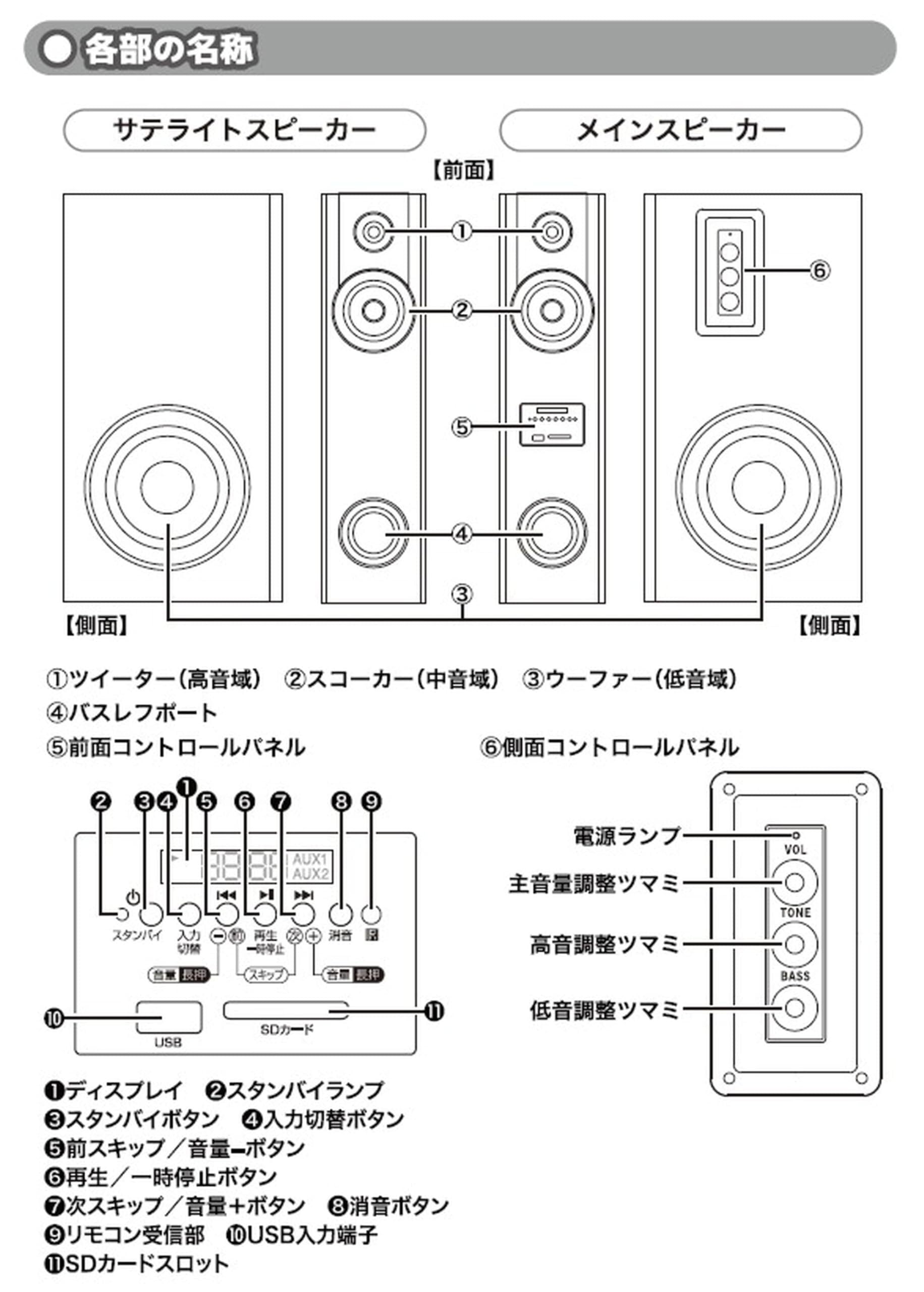[入出力端子] メインスピーカー:音声入力1=3.5mmステレオミニ、音声入力2=RCAピン (左/右)、SDカードスロット、USB-A、スピーカー接続=RCAピン