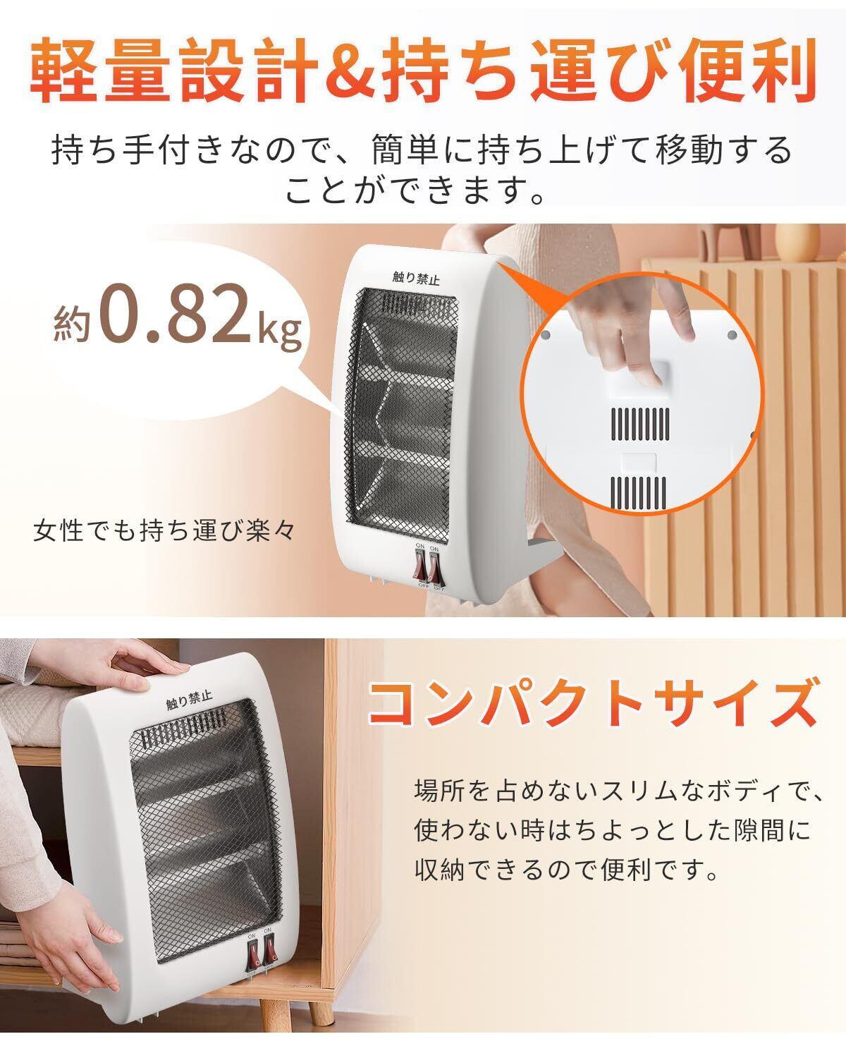 【軽量設計&持ち運びやすい】重さはわずか0.82kg。背面の取っ手を持って、必要なスペースに持ち運びができて便利です。軽量設計のため、使う場所を変えたい時や、お掃除の際も簡単に移動できます。場所を取らないスリムなボディで、使わない時はちょっとした隙間に収納できるので便利です。