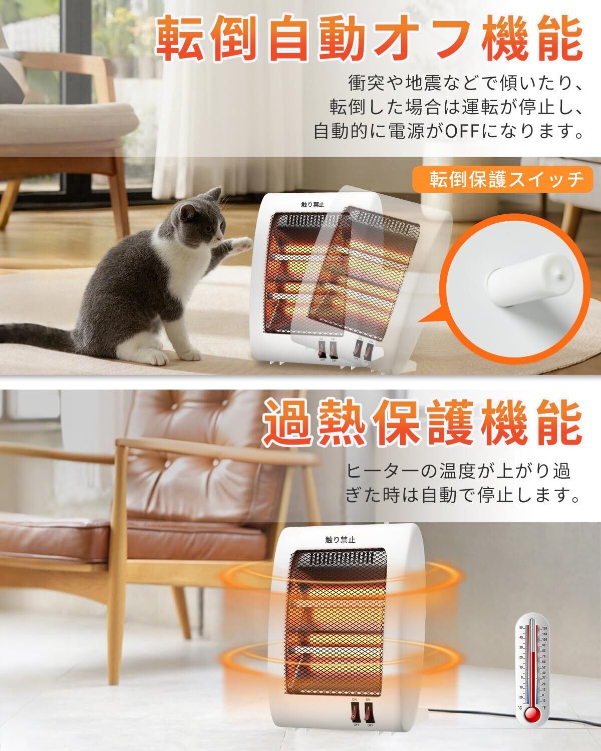 【転倒オフ&過熱保護】誤って転倒と急な状況で製品が倒れた場合、内蔵スイッチが作動し自動的に電源がオフになって、本製品には高度な過熱保護機能を搭載しています。内部温度が異常により安全閾値に達した場合、システムが自動的に電源を遮断し加熱を停止。過熱リスクを効果的に防止します。