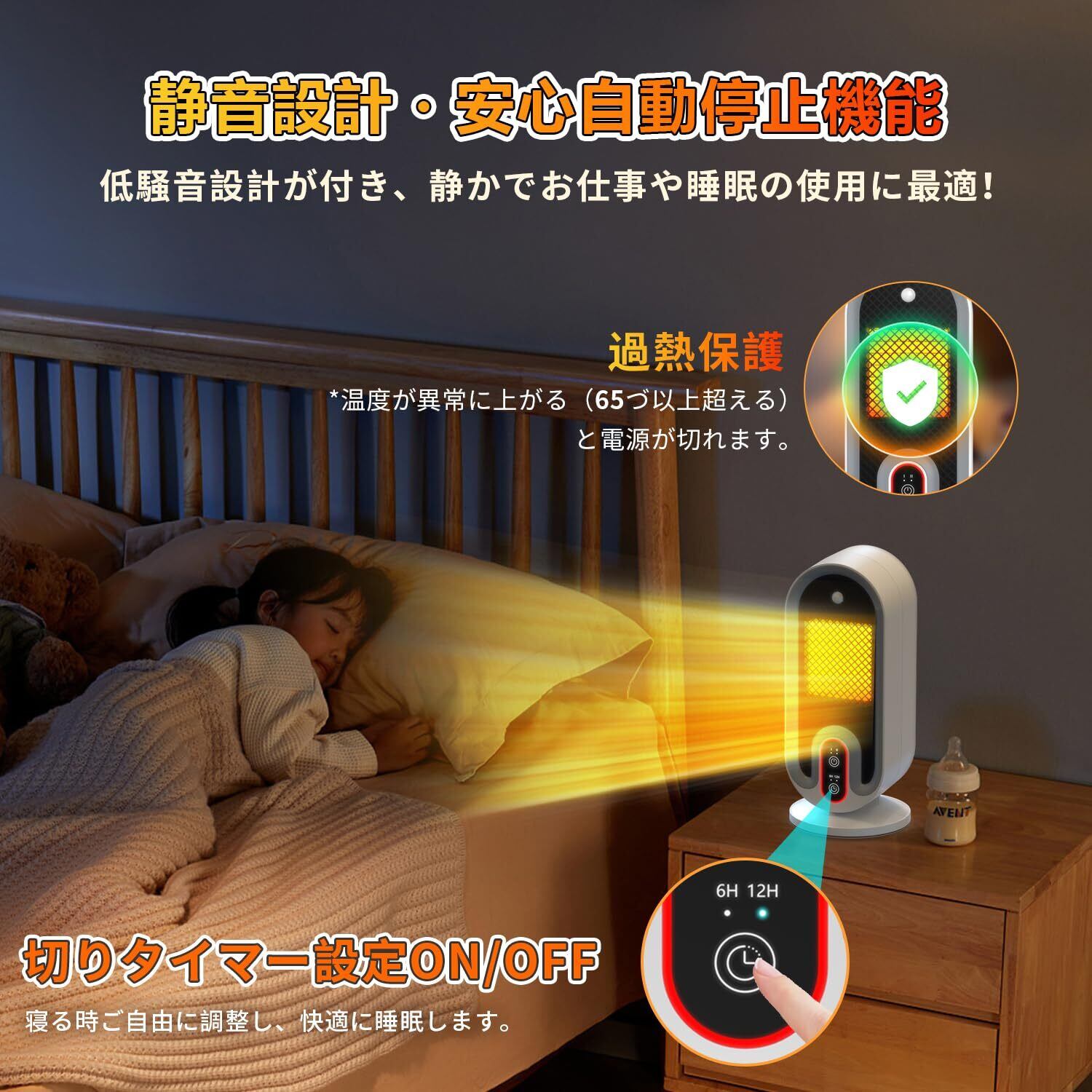 【安全を第一に考え、危険とさようなら!】Fenadekの セラミックヒーター 小型 があることで、より快適に、より愉しく、“安全”に。①転倒OFF:地震などの不意な原因で転倒すると、電源が自動的に切る。②二重過熱保護:内部に温度センサーを搭載し、高温と低温二つの部分の温度を感知して、温度が上昇過ぎた時に、ヒーターが自動的に停止する。③難燃性:V-0級の難燃材料が使用され、過熱保護と転倒保護の仕組みです。内蔵の温度過昇防止器が温度異常を検知したら電源が自動的にすぐ切ります。④正規品:PSE取得済み。安全性を第一の目指として、日本向けに特別に設計されています。