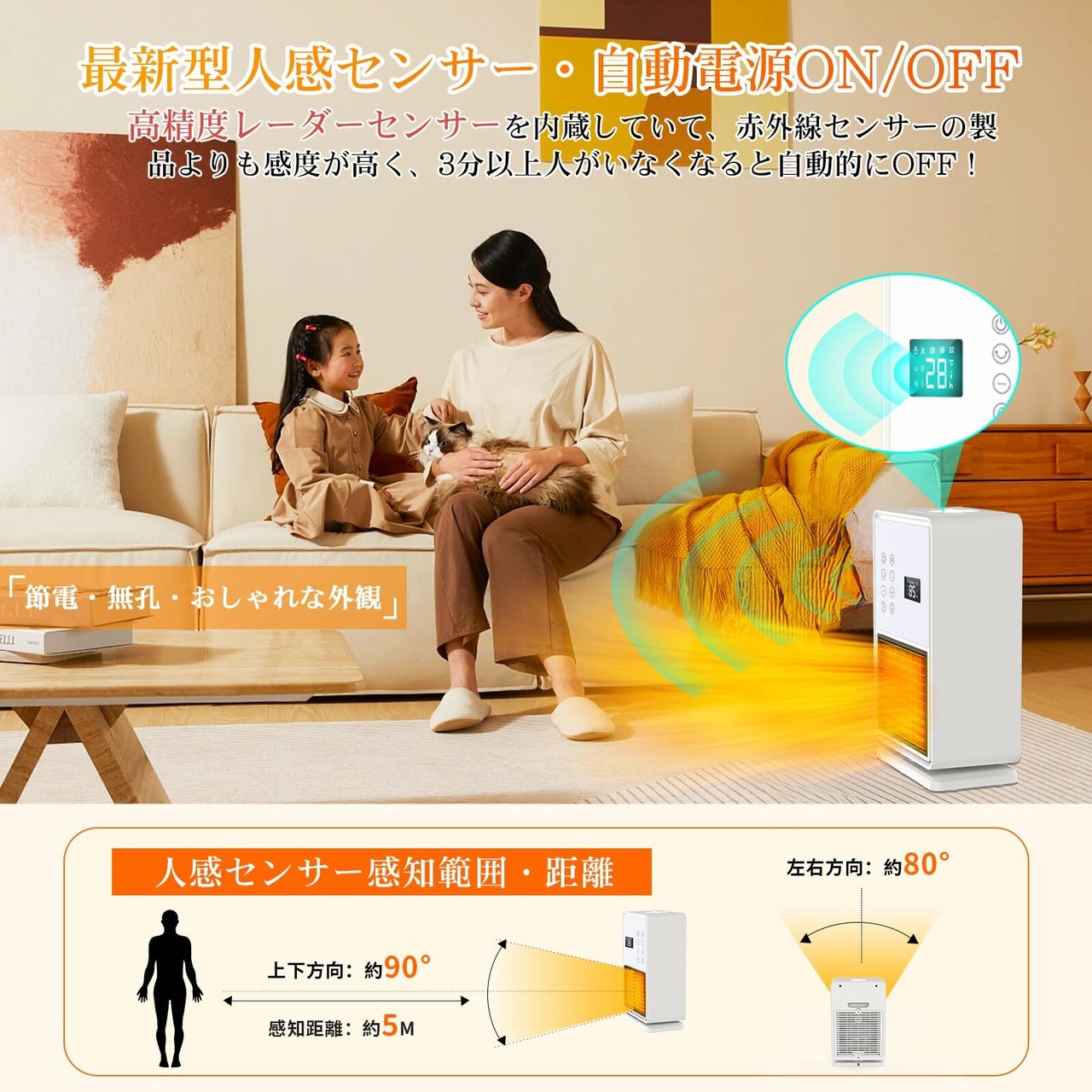 【人体感知機能・タイマー・デザイン】この電気ファンヒーターは、内蔵の高感度レーダーセンサーを利用して人体を検知します。人体感知機能を有効にすると、暖房器は自動的に周囲の人体を感知します。もし3分間以内に人体を検知できない場合、電気ファンヒーターは自動的に電源を切ります。この人感機能は、他の製品の赤外線センサーよりもより高い感度を持ち、より正確に人体を検知することができます。ヒーターには1〜24時間まで1時間単位で設定できるタイマー機能が付いているので、就寝時や外出時も安心です。また、この電気ファンヒーターは優れた外観デザインも特長としており、美しい見た目で部屋のインテリアにも調和します。