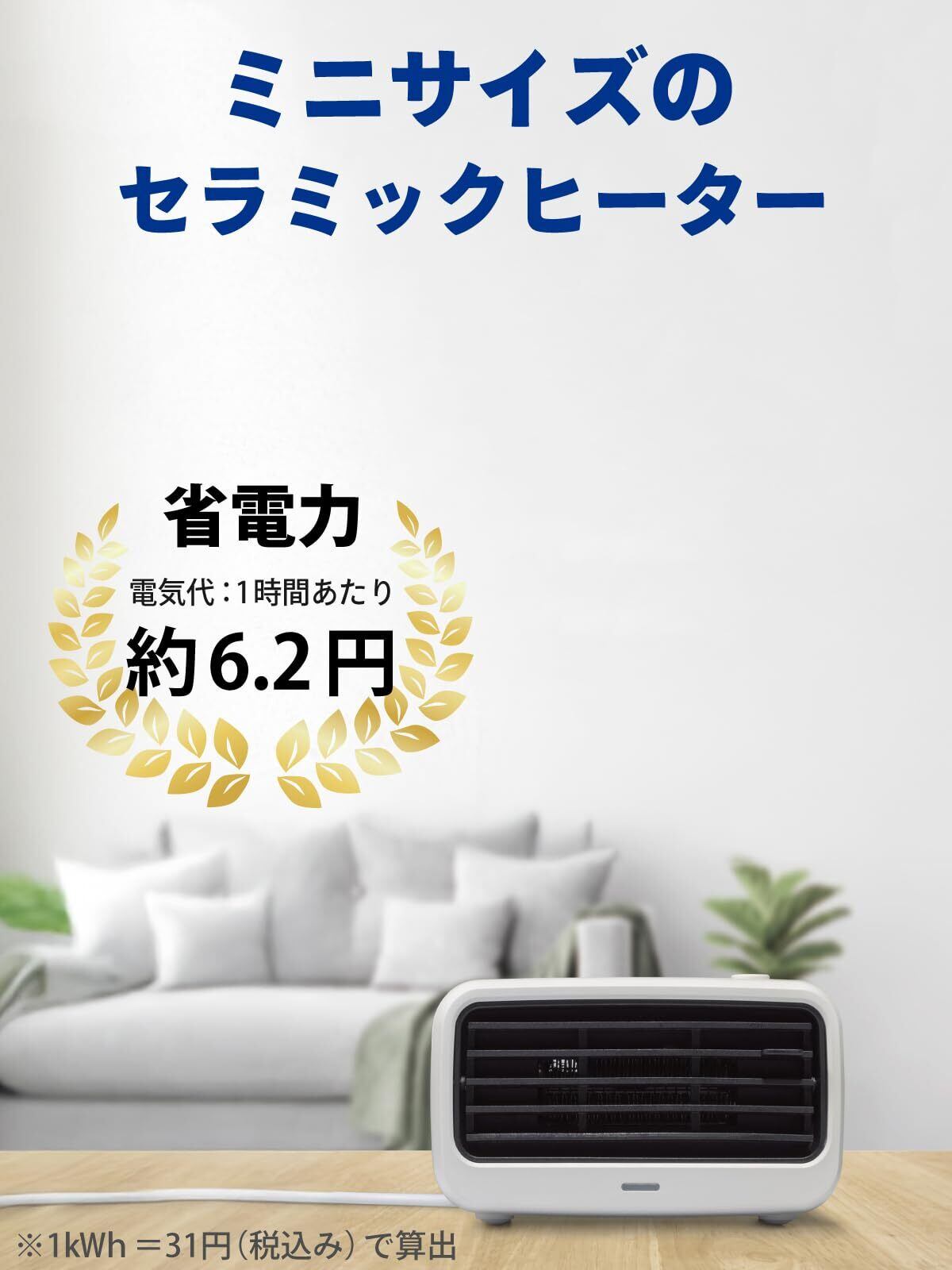 【省エネモデル】消費電力200W、一時間あたりの電気代は約6.2円(1kWh=31円(税込)として計算)。一人用のコンパクトヒーターは電気代の節約にもぴったりです。