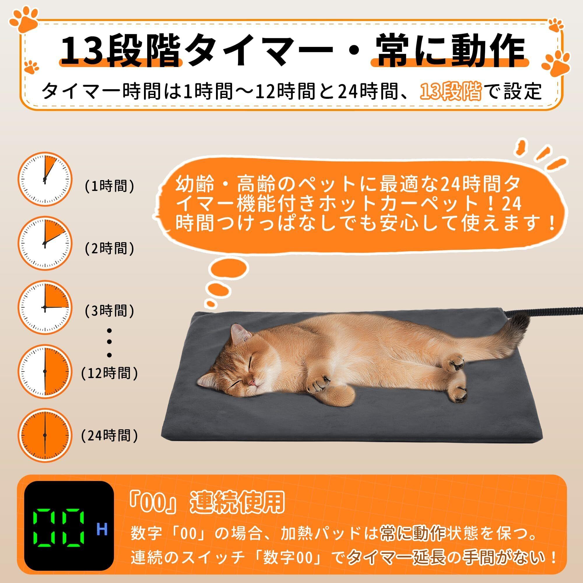 【14段階:1~12時間タイマー 24時間タイマー 常に動作】ご必要に応じて適切な時間(1/2/3...12H)を1時間単位で12段階で設定することができます。このペット用ホットカーペットには新たに24時間のタイマー機能も搭載しており、24時間後には自動的に電源が切れるため、安心して長時間使用が可能です。これにより、類似製品よりも細かくタイマー設定と幅広い選択肢が可能になります。時間を設定せずに連続使用したい場合は、タイマーを「00」に設定すれば常に動作になります。設定した時間に達した後、再びオンにするのを忘れる心配はありません。寒がりの愛犬や愛猫にぴったりの防寒対策品です。