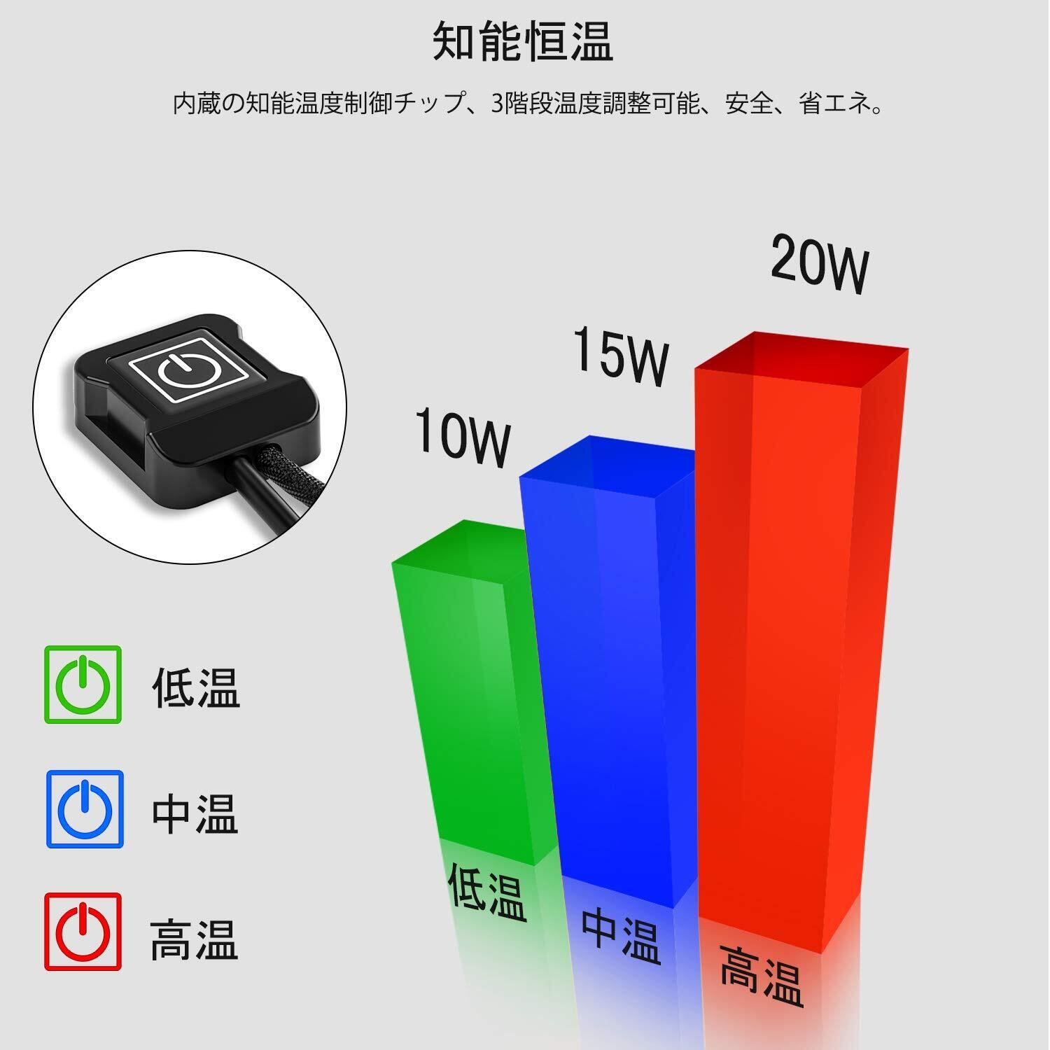 【三段階の温度調整、自在に走るは快適】知能恒温システムを搭載し、左と右の温度を同じに合わせる、加熱不足や過熱などを防ぎます。ケブラー材質を採用し、加熱がもっと早く、更に熱が均一にします。10W、15W、20Wの出力の三段階温度調整可能、消費電力が低く、使用寿命も長い。