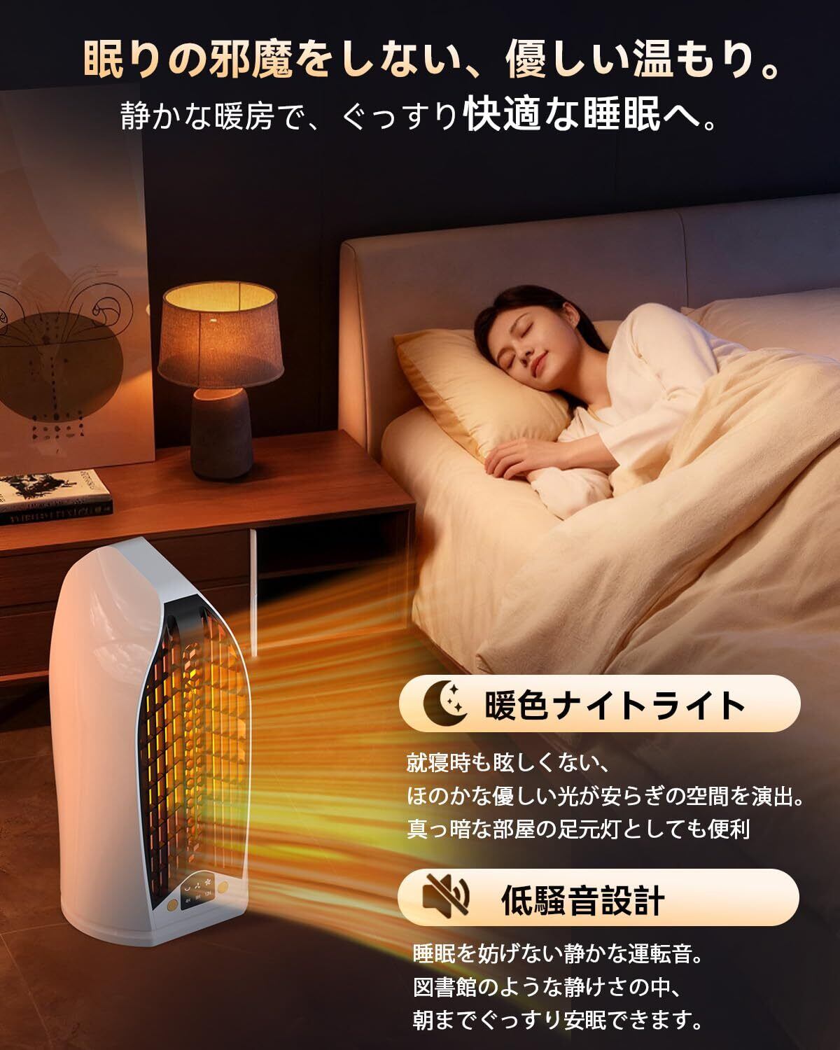 【静粛性 & 便利なタイマーで、快適な睡眠をサポート】超静音設計により、就寝時でもほとんど気にならない運転音。優しい暖色ライトと3段階タイマー(4/8/12時間) で、お休み中の消し忘れも安心。心地よいアンバーナイトライト機能付きで、夜間の足元灯としても活躍し、リラックスした睡眠環境を創造します。