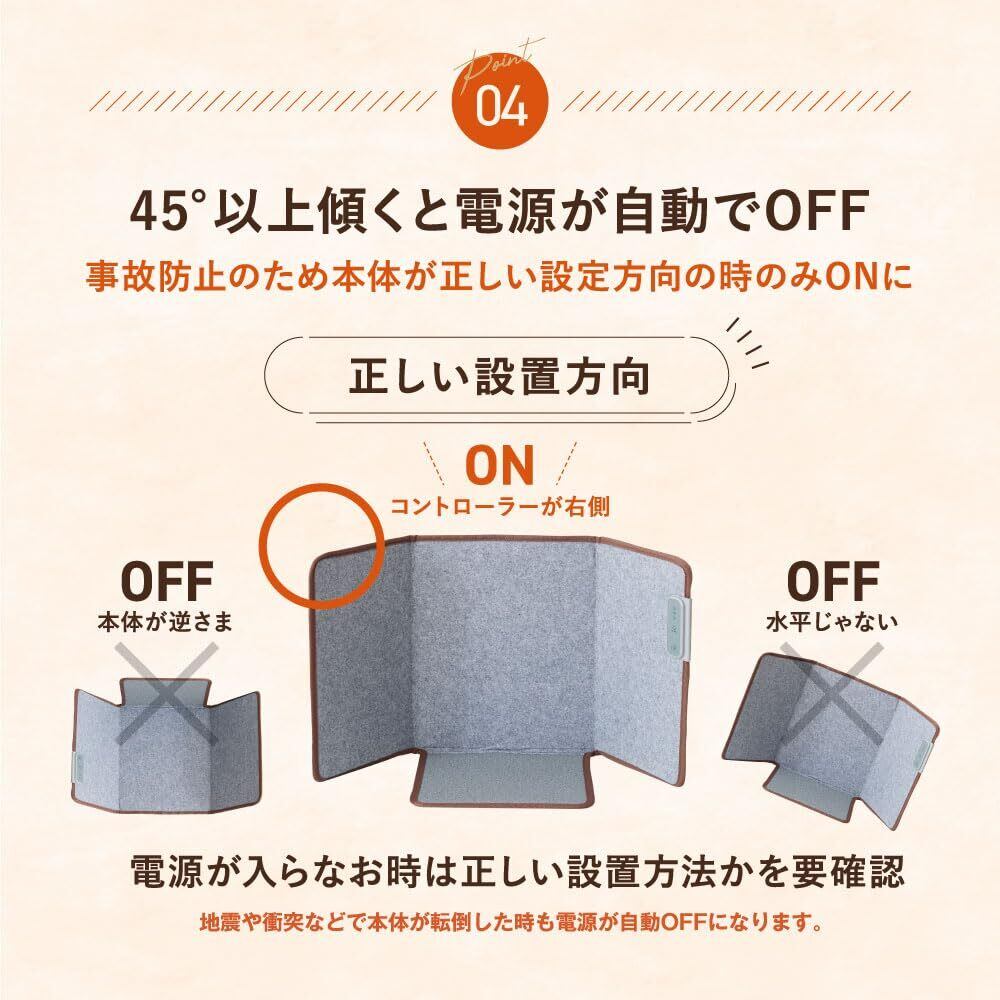 【安心の安全機能!】過熱防止機能や転倒オフ機能を搭載しており、安全に使用できる設計です。例えば、もしヒーターが転倒した際でも、自動的に運転を停止するため、お子様やペットがいる家庭でも安心です。