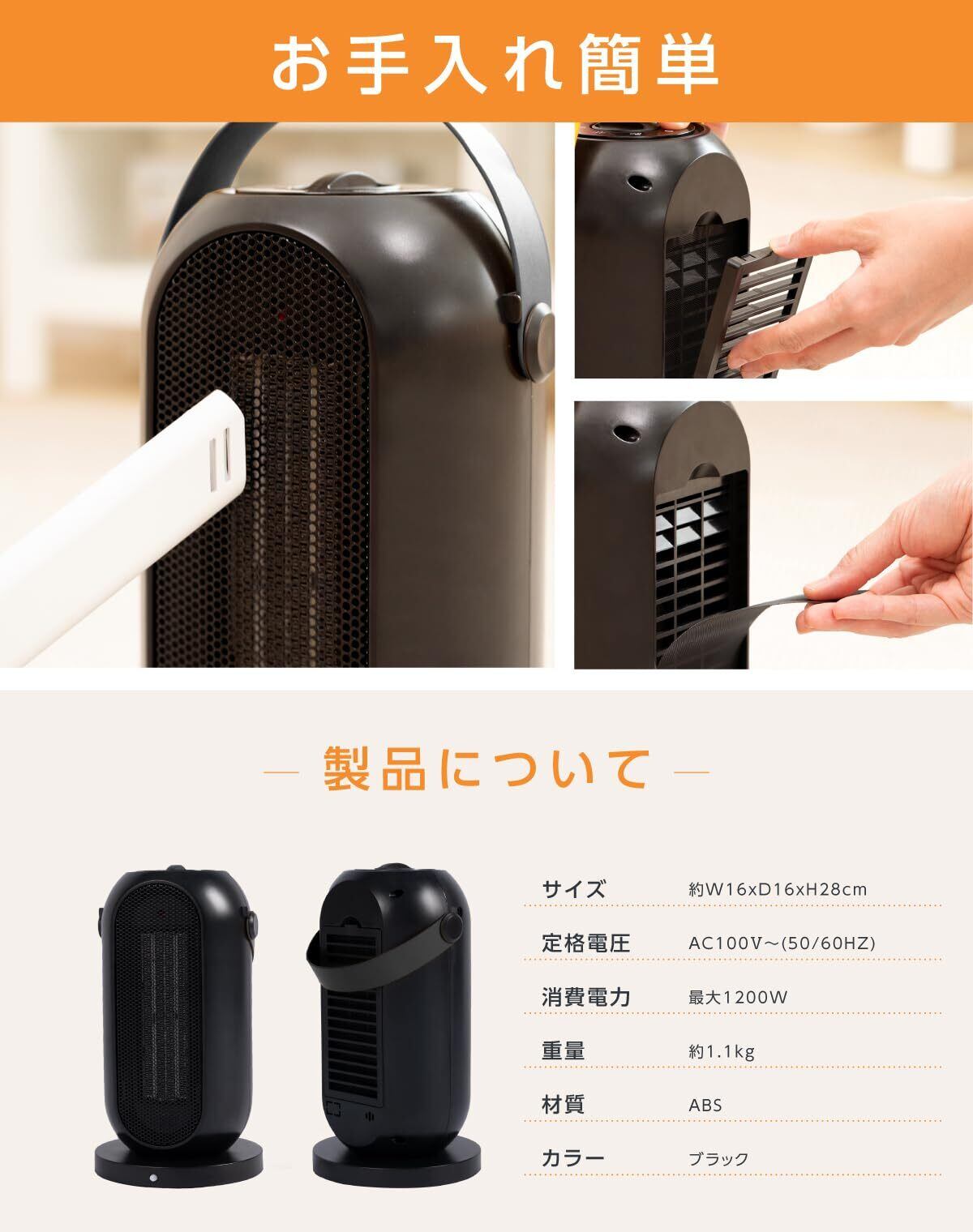 【簡単ダイヤル式&様々な場所活躍】ワンダイヤルボタンで操作が簡単なため、誰でも手軽に利用できます。暖房の必需品として、寒い季節にポカポカの温かさを提供します。寝室、勉強部屋、ベッドルーム、リビングルーム、オフィス、脱衣所、玄関、台所など、さまざまな場所で使えます。【製品仕様】サイズ:約W16xD16xH28㎝ / カラー:ブラック / 材質:ABS / 消費電力 :最大1200W / 重量:約1.1kg/ 電源コード長さ:約1.5m